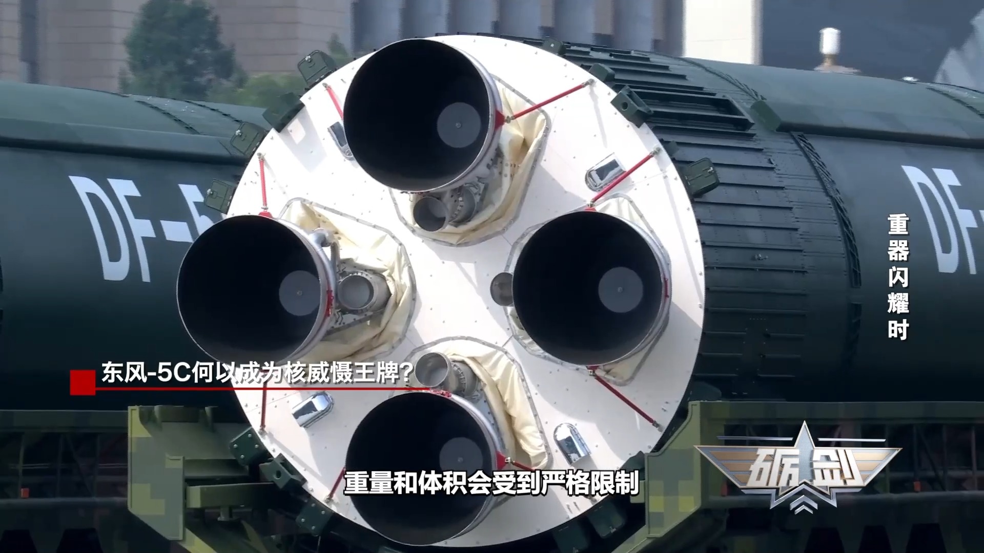 军事专家 邵永灵:东风-5C是一款液体燃料洲际弹道导弹,在阅兵式上使用了三辆车拖运,采用了圆锥体的尖弹头。