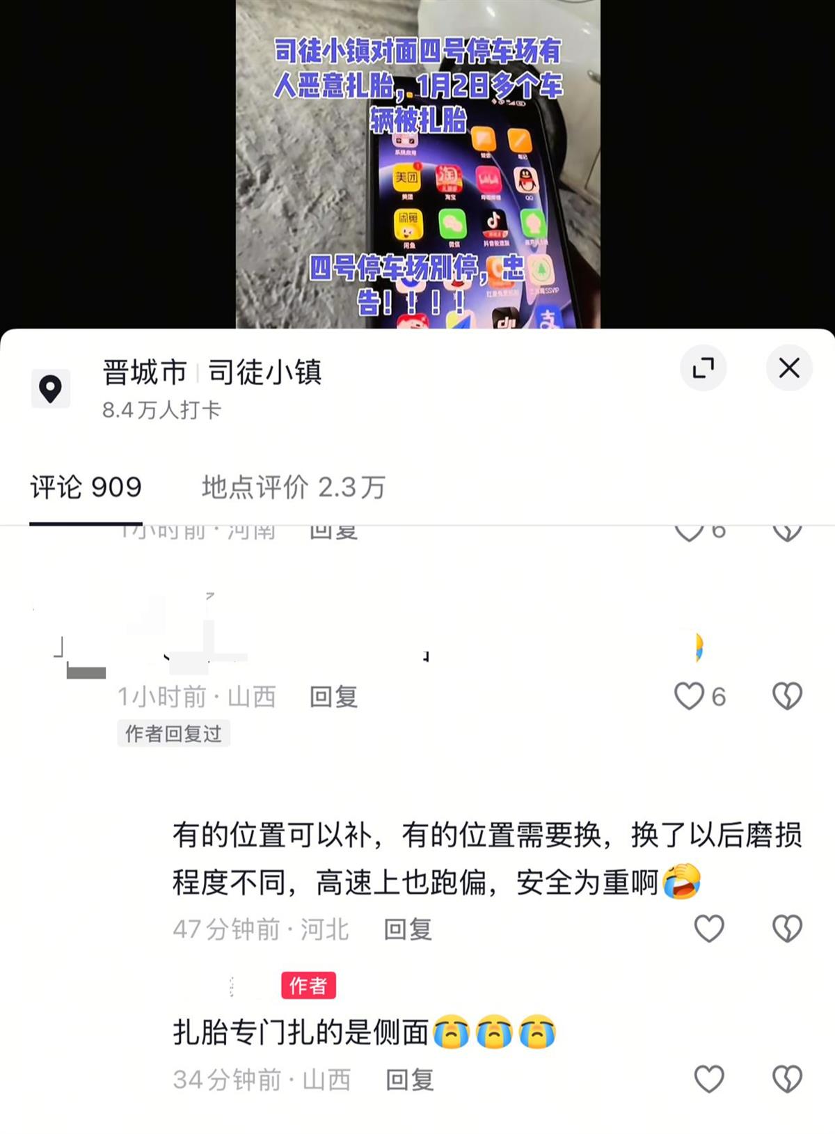 极目新闻此前报道,网友反映,1月2日晚9时40分许,发现自己停在山西晋城司徒小镇附近一处停车场内的车辆车胎被扎。网友在帖子及回复网友询问中称,车辆停在司徒小镇斜对面四号停车场,“专门扎的(胎)侧面”。该网友向记者介绍,车胎被扎的情况不止自己一台车,他花了200元补了胎。据景区工作人员介绍,该处“其实是没有人管理的,也没有收费”,警方已介入处理。
