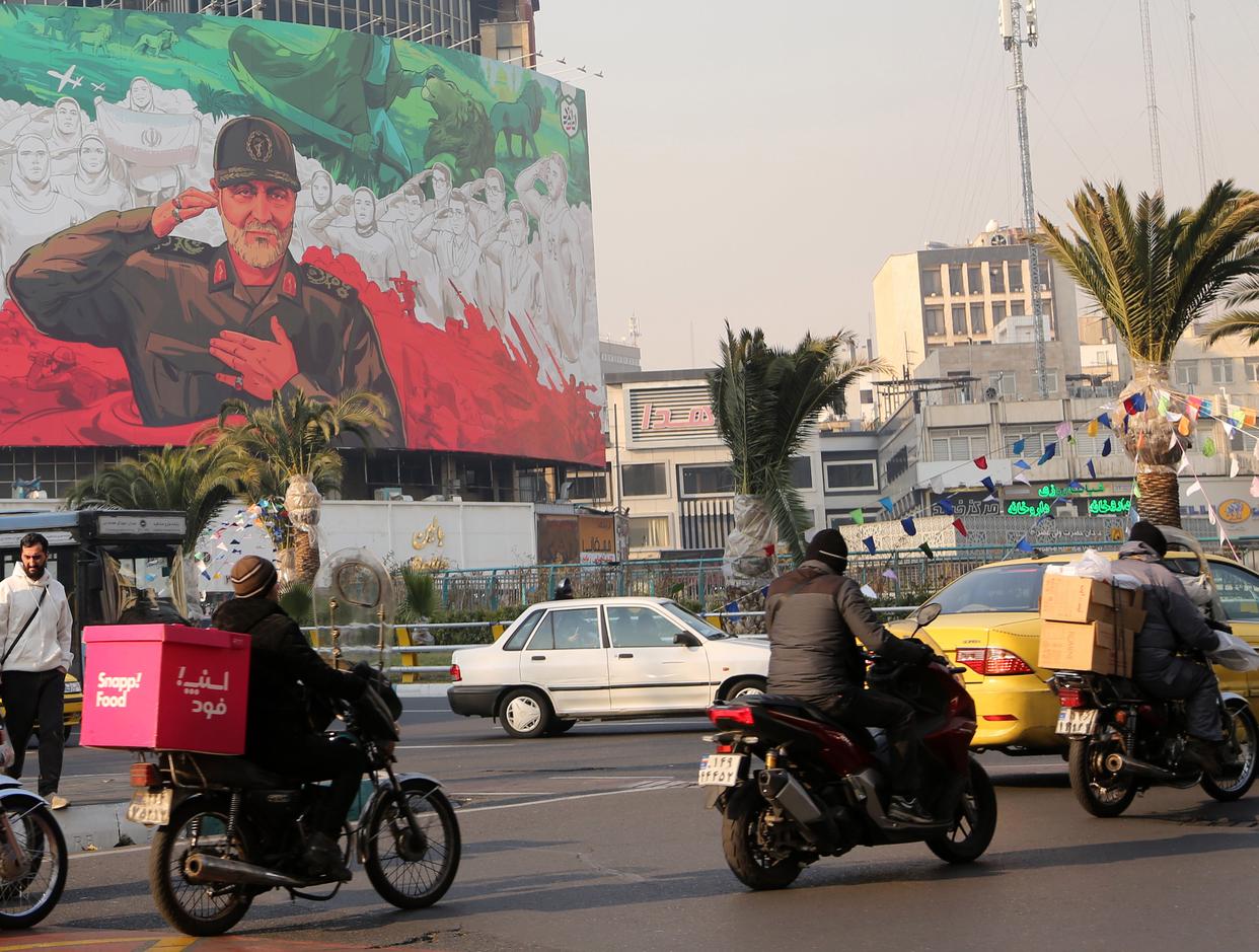 2026年1月6日,在伊朗首都德黑兰街头,车辆经过一幅绘有伊遇袭身亡的高级将领卡西姆·苏莱曼尼形象的宣传海报。新华社发 近日,伊朗因物价上涨和货币贬值爆发示威活动,多地发生骚乱,造成人员伤亡。特朗普在多个场合称美国“正密切关注”伊朗局势,威胁或对伊朗进行“严厉打击”。