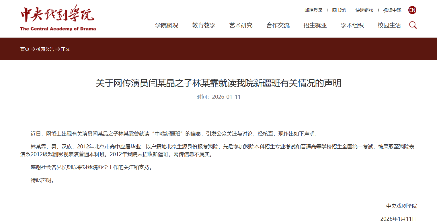 1月11日晚,中央戏剧学院对此发布声明回应:“林某霏,男,汉族,2012年北京市高中应届毕业,以户籍地北京生源身份报考我院,先后参加我院本科招生专业考试和普通高等学校招生全国统一考试,被录取至我院表演系2012级戏剧影视表演普通本科班。2012年我院未招收新疆班,网传信息不属实。”