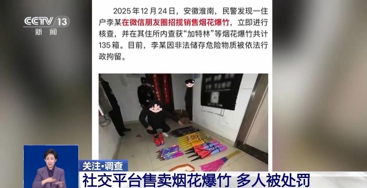 岁末年初,烟花爆竹进入销售旺季。在社交平台或者朋友圈中,您有没有刷到过“烟花爆竹送货上门”的广告?千万注意,这其实是违法行为。售卖烟花爆竹需要符合哪些条件?私自在社交平台售卖及购买存在哪些安全隐患?一起来看,最近多地警方依法查处的多起在朋友圈、社交平台上兜售烟花爆竹的案件。