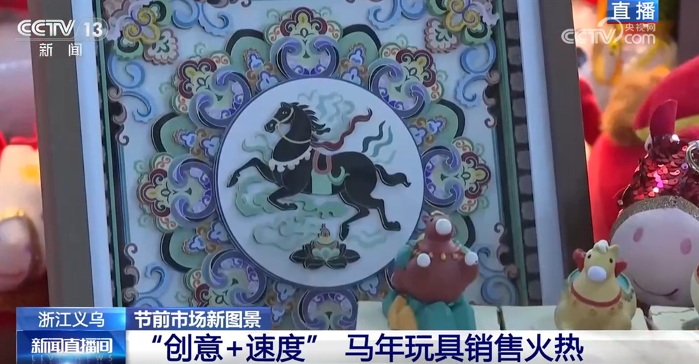 说完了抢抓商机的“哭哭马”,记者觉得今年的义乌会带给您全新的惊喜,一批以生肖马为灵感的“创意年味”加速奔向你。看这边,这款“马踏祥云”立体相框用上了敦煌风的配色,既保留了吉祥如意的老传统,又显得特别新潮。再看这些生肖马的小玩意儿,被设计成了盲盒、挂件、摆件……花样可多了!上面还印着实在又讨喜的字,年轻人一看就喜欢,买了不光自己用,还爱晒到朋友圈。