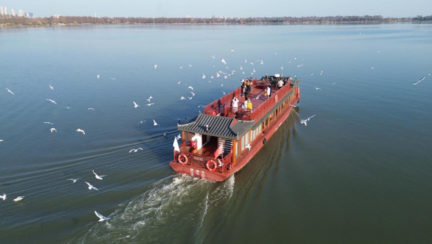 在游船二层甲板上,游客王女士不断用相机捕捉红嘴鸥掠过湖面的身影,“它们最近时离我只有两三米,红嘴白翅在阳光下特别治愈!”她表示,自己是受社交平台上观鸥视频吸引专程前来,“这趟武汉之行完全超出预期”。