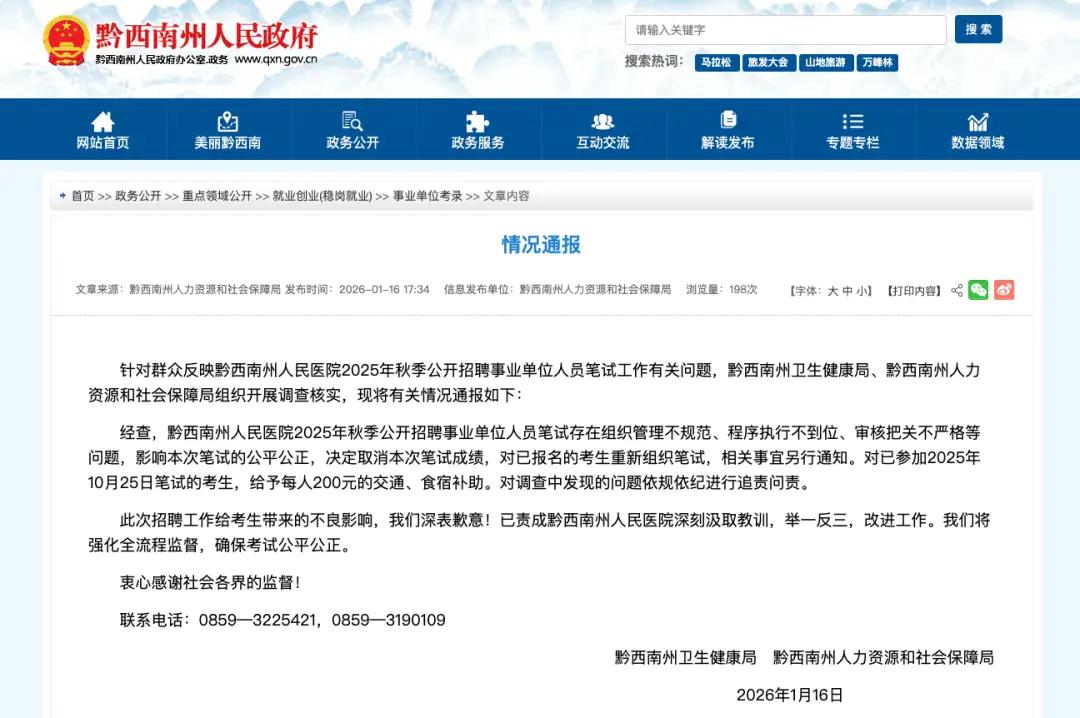 经查,黔西南州人民医院2025年秋季公开招聘事业单位人员笔试存在组织管理不规范、程序执行不到位、审核把关不严格等问题,影响本次笔试的公平公正,决定取消本次笔试成绩,对已报名的考生重新组织笔试,相关事宜另行通知。对已参加2025年10月25日笔试的考生,给予每人200元的交通、食宿补助。对调查中发现的问题依规依纪进行追责问责。