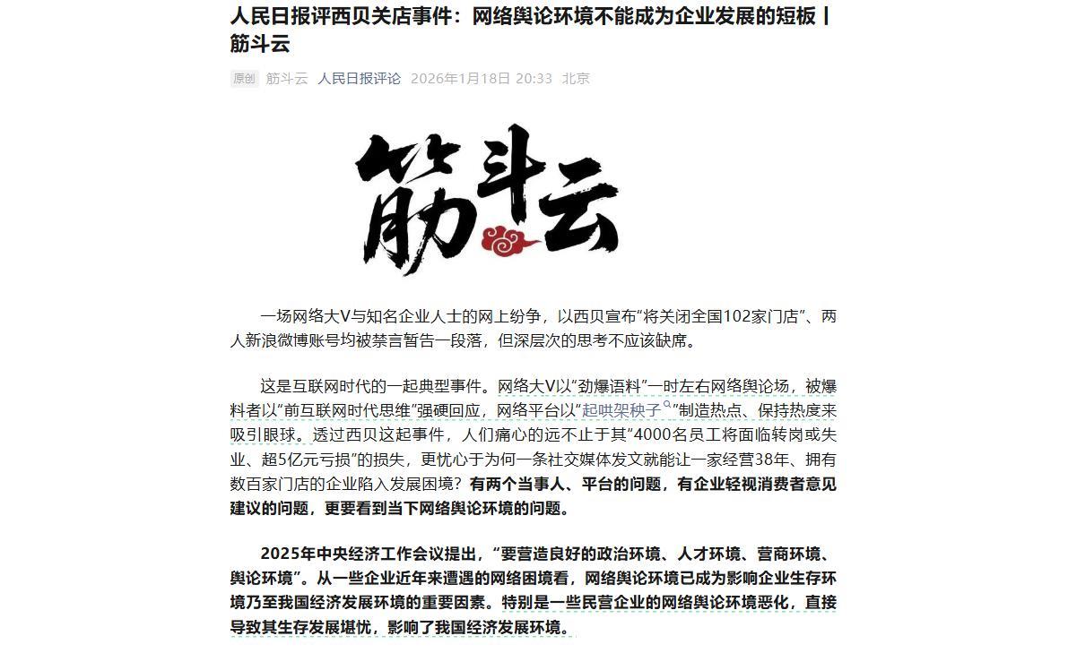 此前,人民日报发布《网络舆论环境不能成为企业发展的短板》,1月18日晚,贾国龙转发了人民日报发布的文章《人民日报评西贝关店事件:网络舆论环境不能成为企业发展的短板》,回应称:人民日报重大表态!相信组织,依靠法律,团结伙伴,一万七千名西贝人,全力以赴为顾客服务,全力以赴自救!