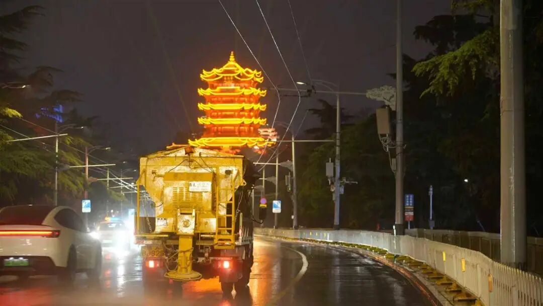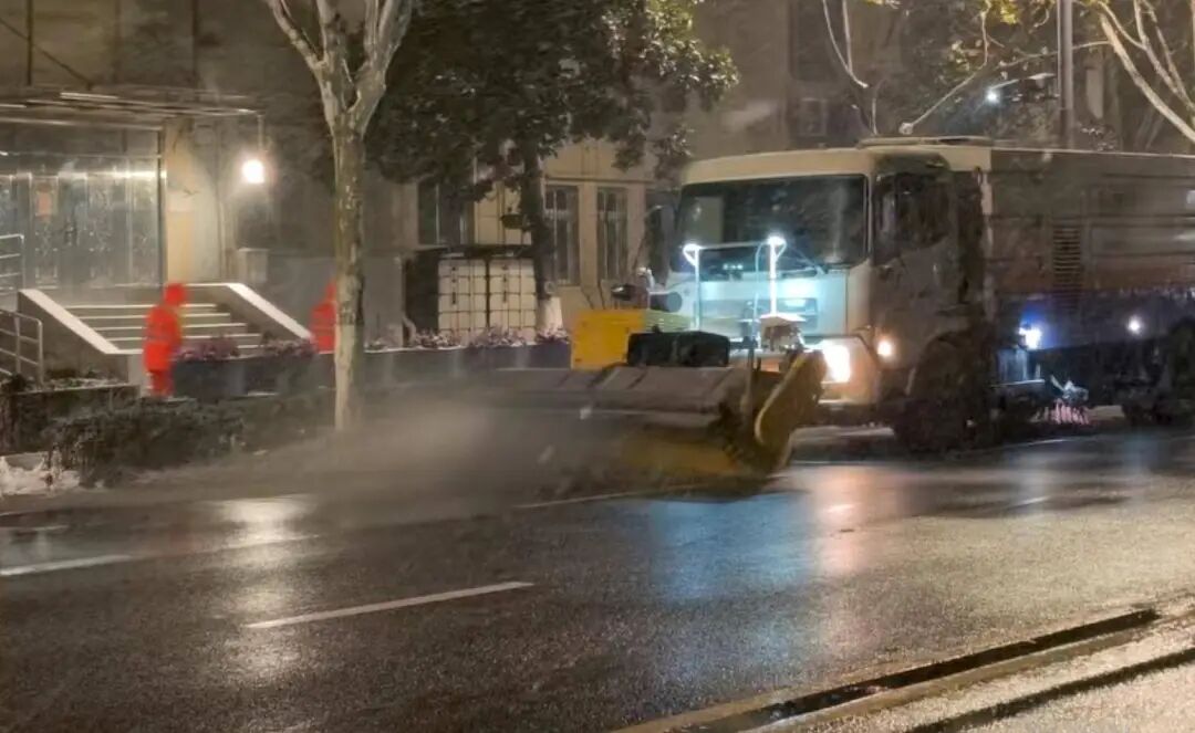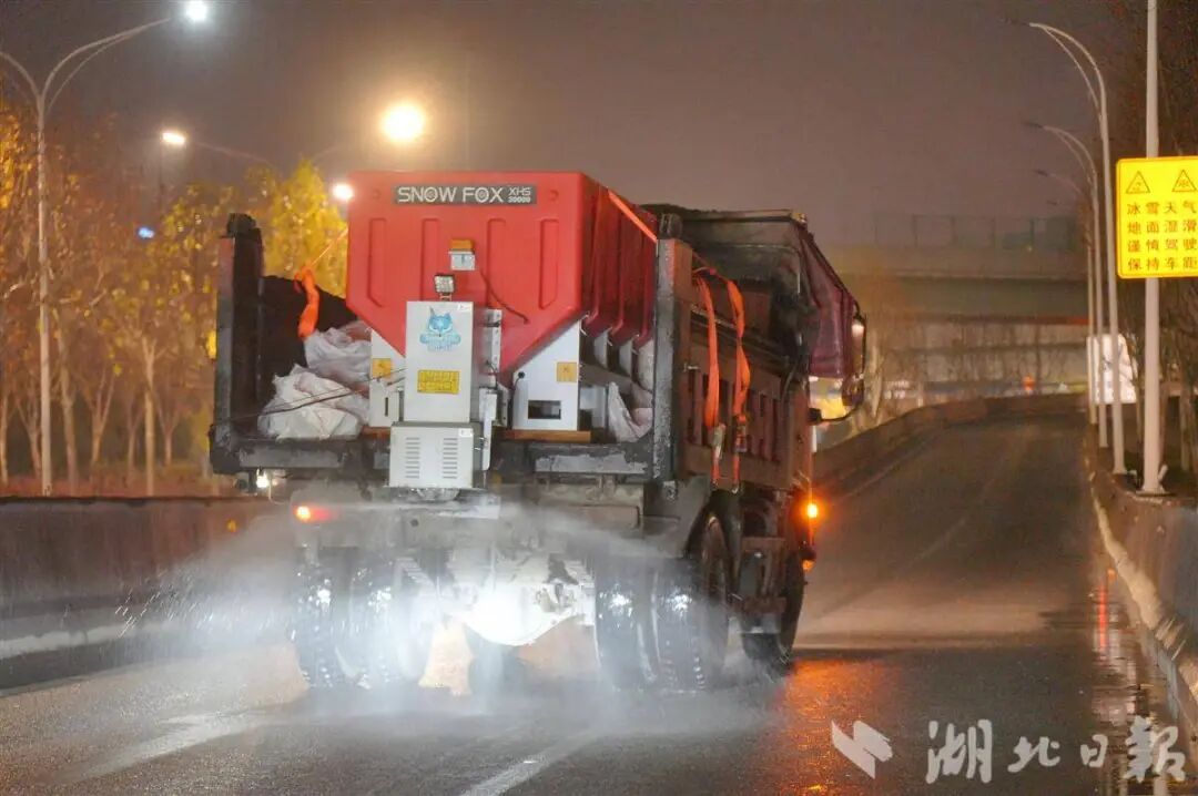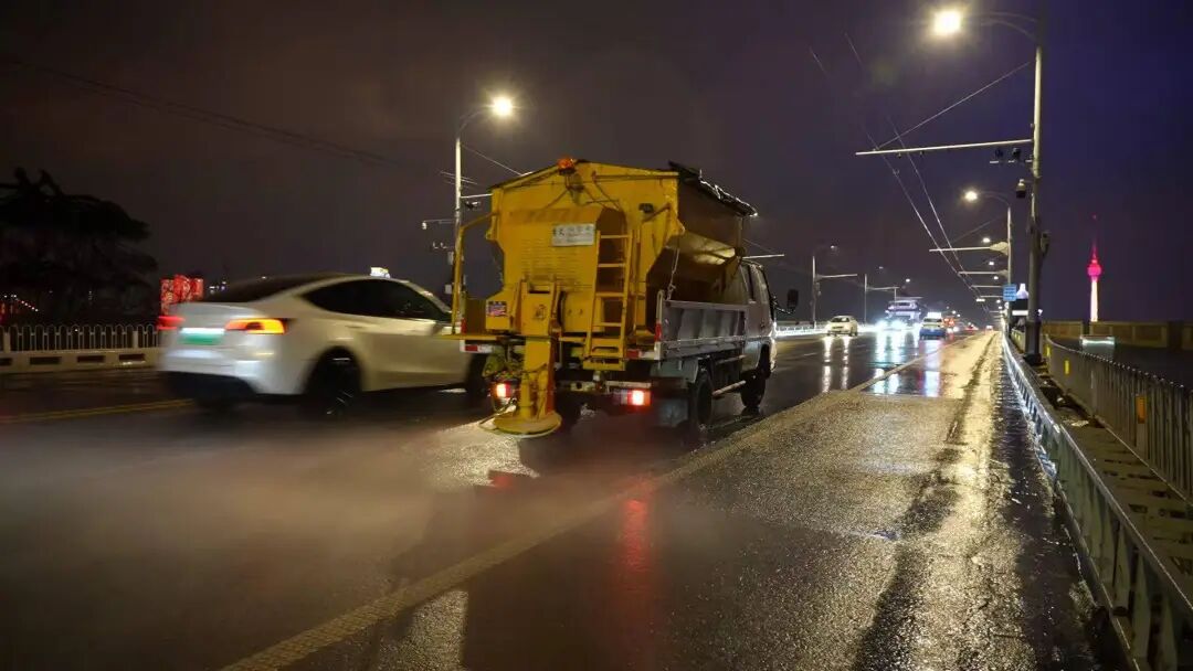 与此同时,在城市的路网中,交警的身影在车流与雪花间格外醒目。他们守桥梁、护学岗,确保每一条道路都是安全回家的路。而凌晨时分,重型撒布机缓缓驶过长江大桥,在桥面留下防冰的“盐痕”,那沙沙的作业声,是夜间最深沉的安眠曲。