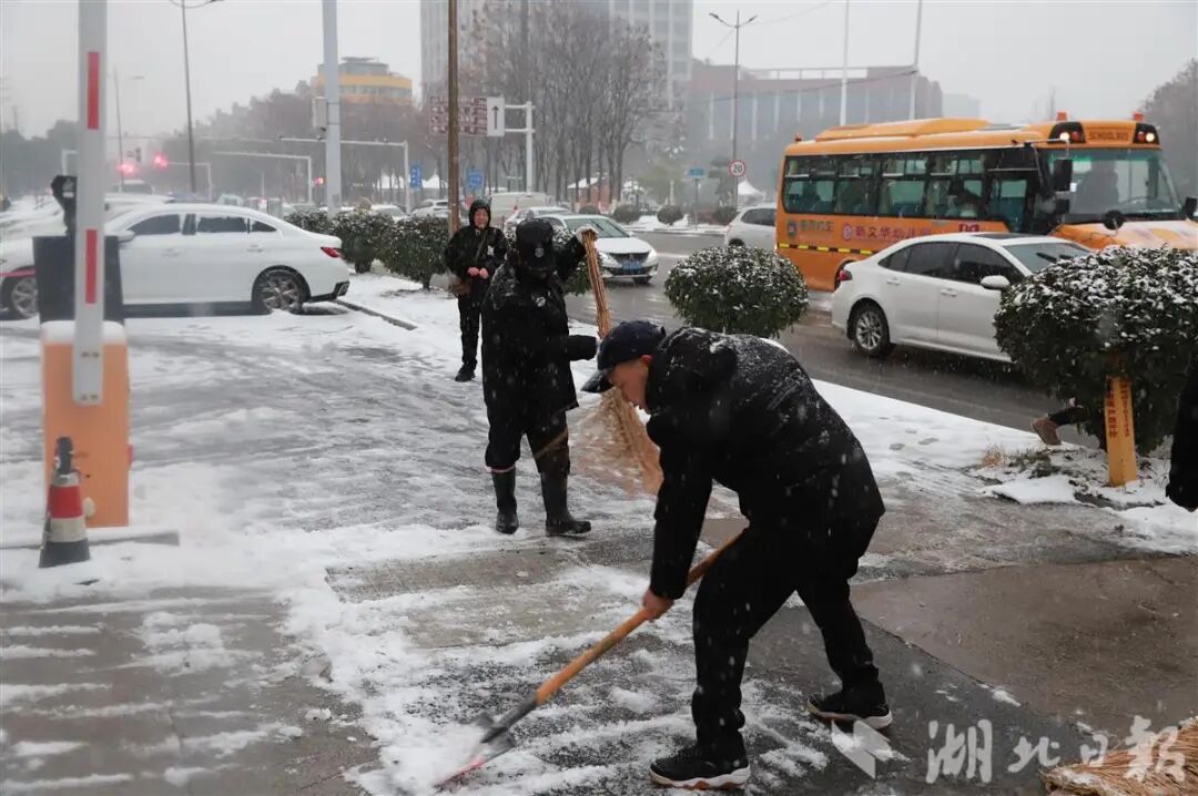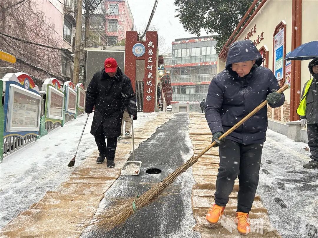 雪仍在下,守护也在持续。在武昌区何家垅小学校门口的上坡路段,几位老师手持铁锹、扫帚,一边清扫积雪,一边在坡道上铺好防滑草垫。寒风扑面,他们的身影却稳稳立在雪中,为孩子们筑起一道看得见的安全防线。
