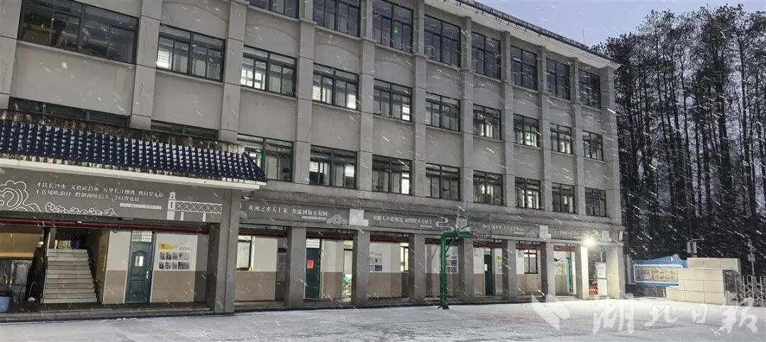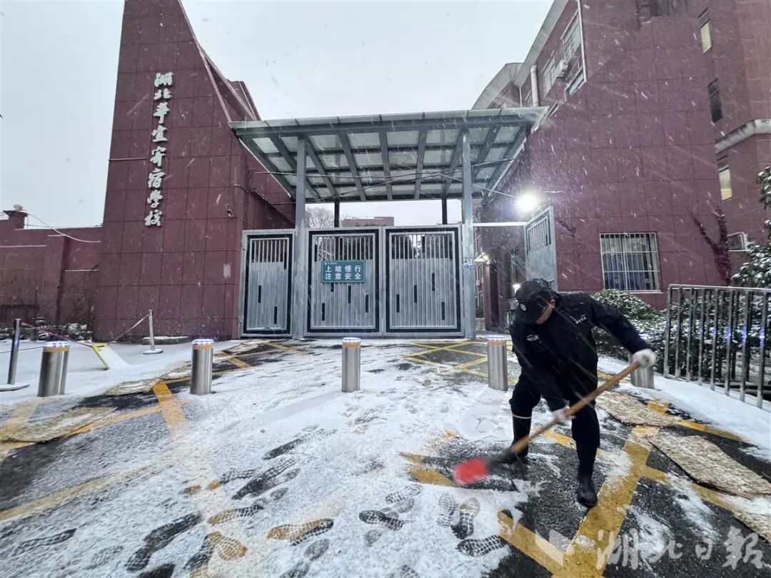 今天天还未亮,校园里已是一片忙碌。凌晨五点,湖北华宜寄宿学校的安保和环卫人员便开始清扫校门及周边积雪。七点不到,校领导已守候在校门口,微笑着迎接陆续返校的小学生。