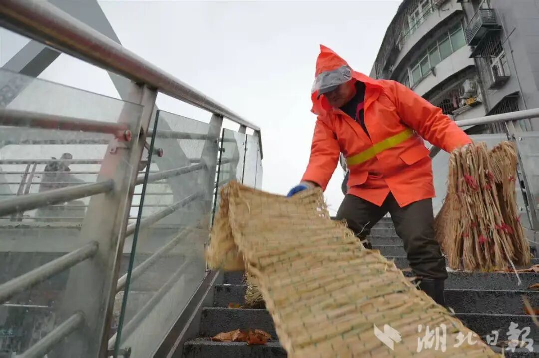 预防性布防,不仅体现在道路上,也体现在行人必经之处。早在昨天17时,吴家山环山路天桥上,十余名环卫工人和执法队员就从皮卡车上卸下一捆捆防滑草垫,沿着天桥两侧铺设开来。“这桥两边都是学校,早晚接送孩子的人流特别集中。早点把草垫铺好,安全更有保障。”吴家山街综合执法中心副主任陈伟一边协调一边介绍。这份“赶早”的贴心服务,得益于平台对学校、商圈、地铁口等人流密集点位的重点关注与任务派发。