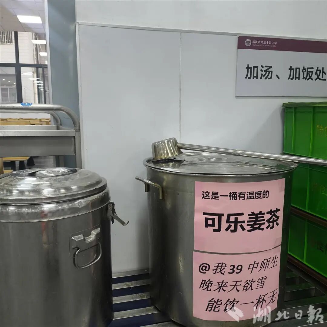 而在武汉市第三十九中学,食堂早早熬好了姜汁可乐,一杯杯热气腾腾的饮料,成了雪天里最贴心的问候。