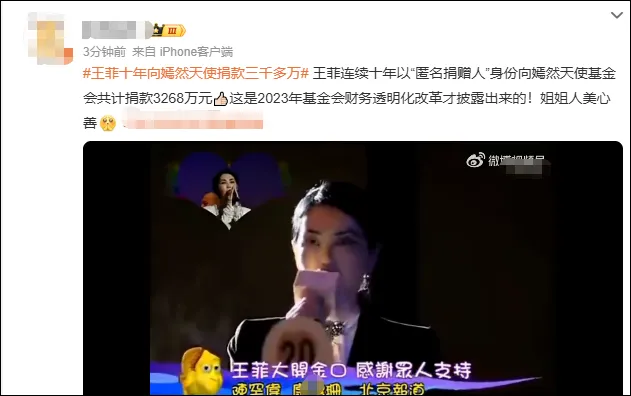 今早9点,有网友在社交平台发布视频,称王菲连续十年以“匿名捐赠人”身份向嫣然天使基金会共计捐款3268万元,同时曝光了一段王菲的走心发言视频。