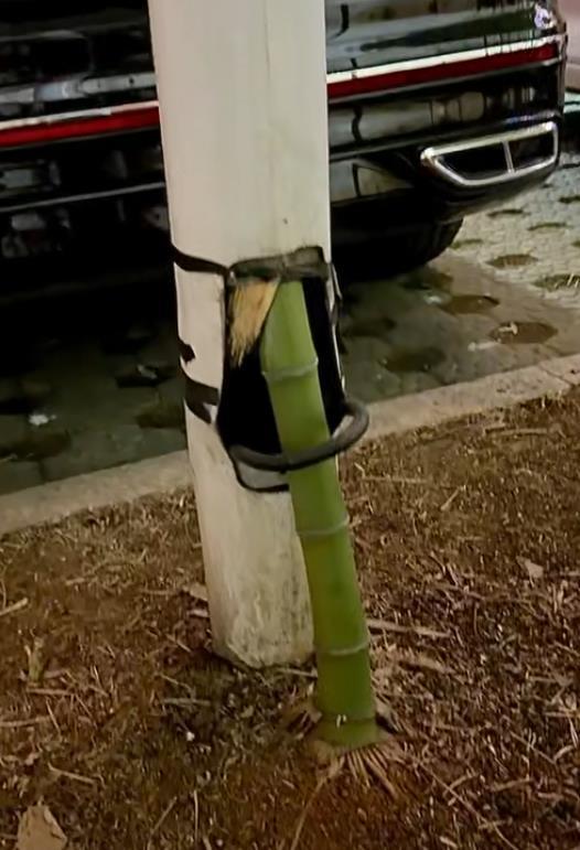 20日下午,记者致电新昌县世贸广场,工作人员告诉记者,停车位那边种了很多竹子,有顾客停车时车尾撞到路灯杆,撞歪了一点,路灯杆下面有一个维修口,竹子歪打正着钻进去了,已经有很多年。现在路灯是不亮的,灯罩已经摘了。其实商场员工今年早些时候就看到了竹子从路灯杆里长出来,也议论过。
