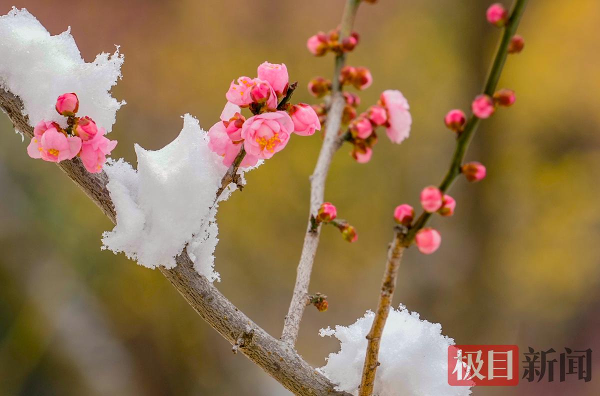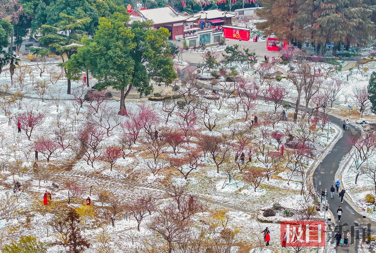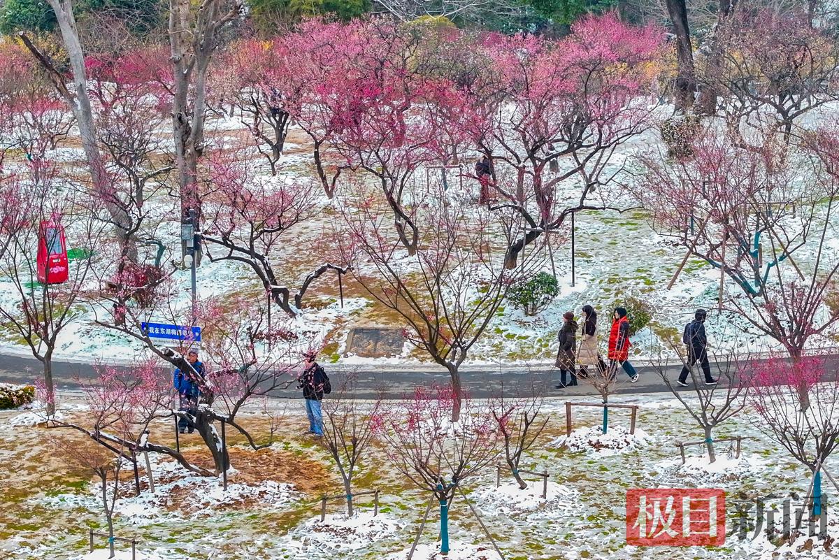 1月21日,大寒已过,寒意未消,武汉东湖梅园还在首场降雪的银装素裹之中。红梅吐艳、腊梅飘香,晶莹的白雪与凌寒吐艳的红梅相映成趣,为冬日园林勾勒出一幅“雪映寒梅别样红”的静谧画卷,吸引了不少市民游客前来踏雪寻梅。