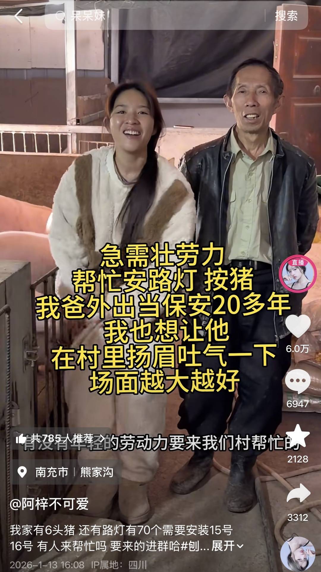 1月13日,阿梓在网上发布视频,提到村里正在安装路灯,老人居多,急需年轻人帮忙,并邀请粉丝们来吃刨汤宴。没想到,这条视频引来近万人自发前往。