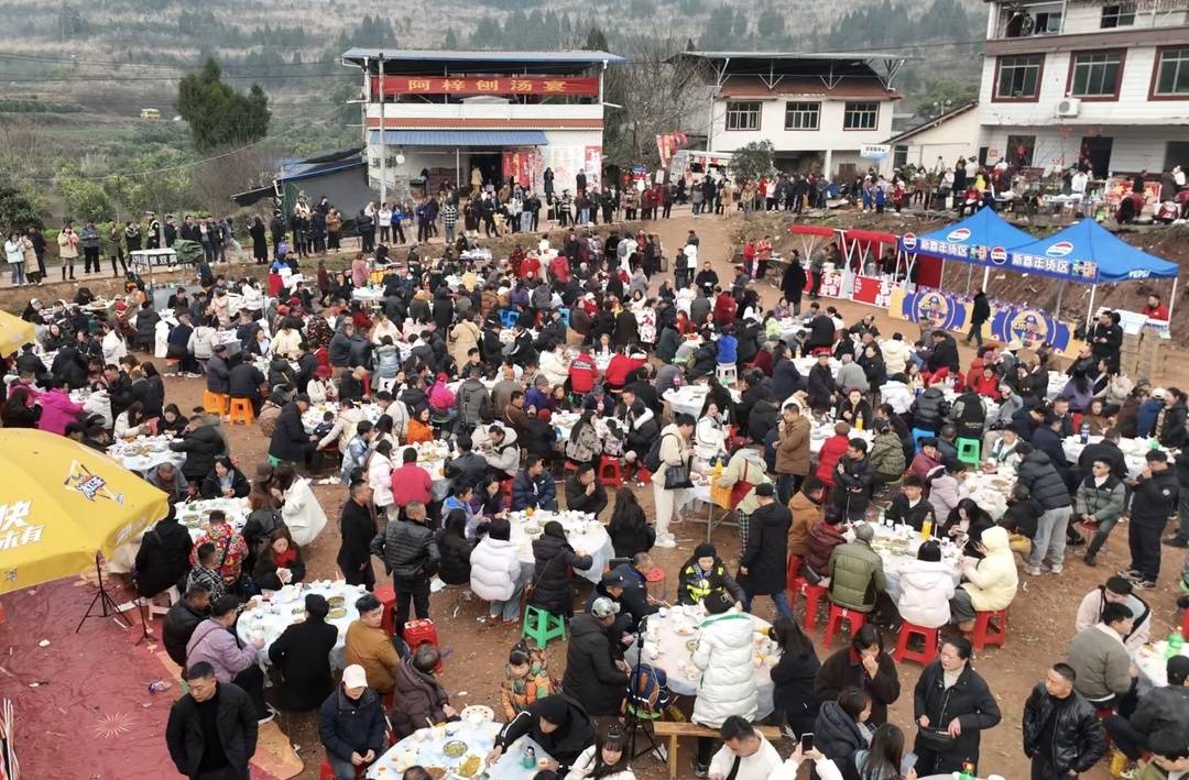不到八点,院坝、田埂、村道边,凡能立足处,皆是人影。临时垒起的土灶火舌乱蹿,数十张借来的方桌挤满晒场,花椒与猪肉的浓烈香气,蒸腾在清冷的空气里。