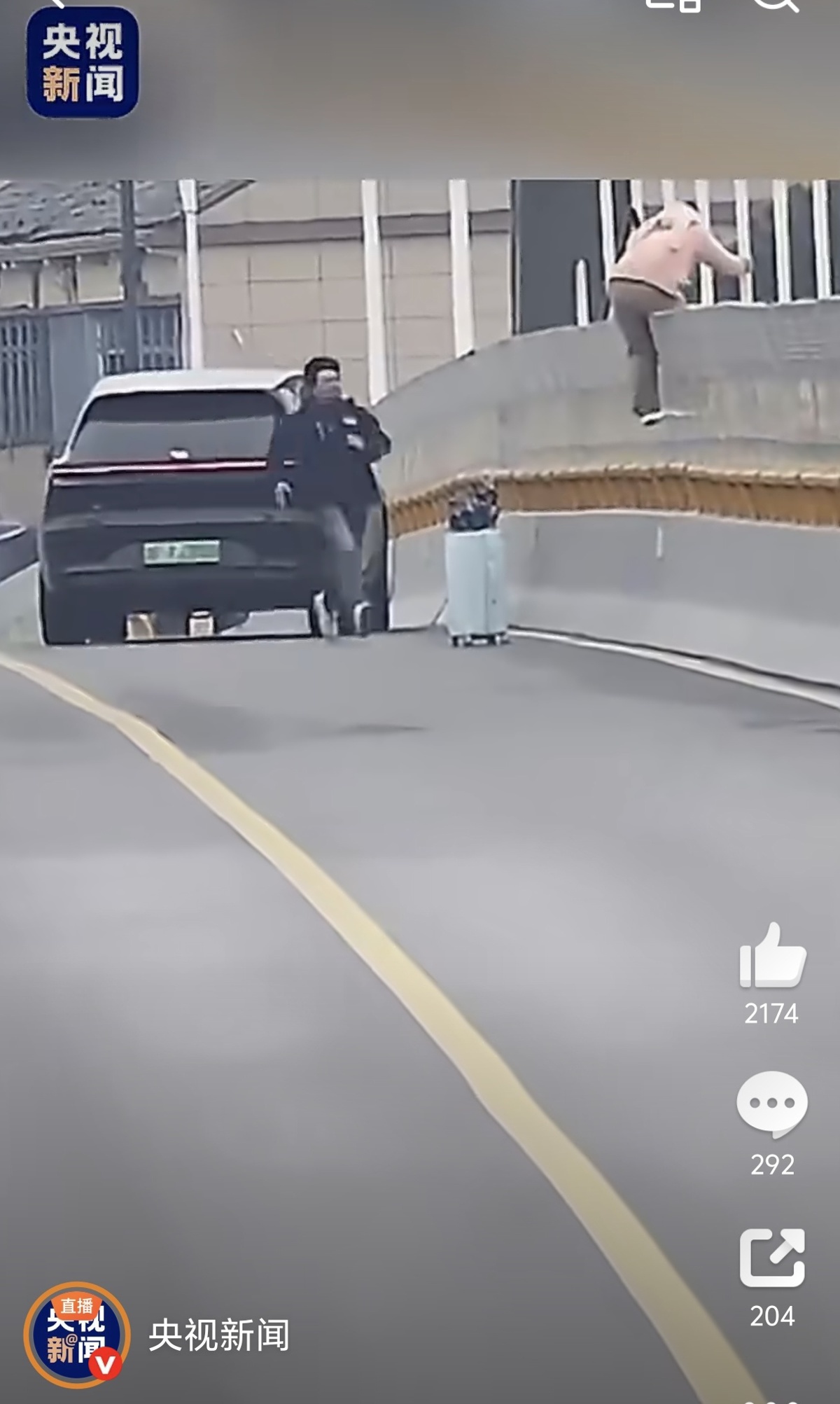 视频显示,一位身穿粉色上衣的女士将行李箱留在路边后,爬上桥面栏杆欲轻生,一名驾驶车牌为浙FFJ3808黑色理想车的男子立马将车停在一旁后,下车后飞奔救人,成功将人救下,待民警到场后救人男子默默离开。