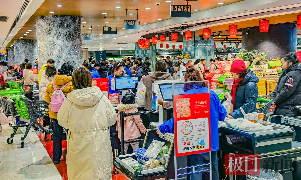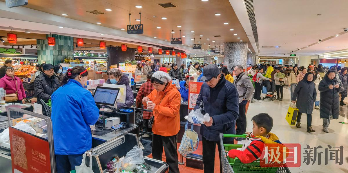 春节临近,年味在武汉的大街小巷里迅速升温。2026年2月1日,众多武汉市民趁周末到商超选购商品,为节日筹备年味商品,三镇商超已全面开启“春节模式”,市民“打年货”的热情高涨。汉口航空路一家大型超市货架满满当当、客流络绎不绝,顾客排队购物付款,周边餐饮店也是人多热闹。