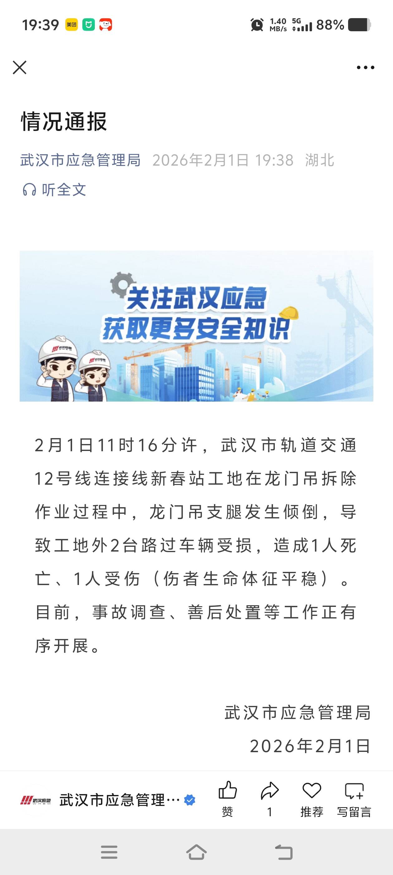 2月1日11时16分许,武汉市轨道交通12号线连接线新春站工地在龙门吊拆除作业过程中,龙门吊支腿发生倾倒,导致工地外2台路过车辆受损,造成1人死亡、1人受伤(伤者生命体征平稳)。目前,事故调查、善后处置等工作正有序开展。