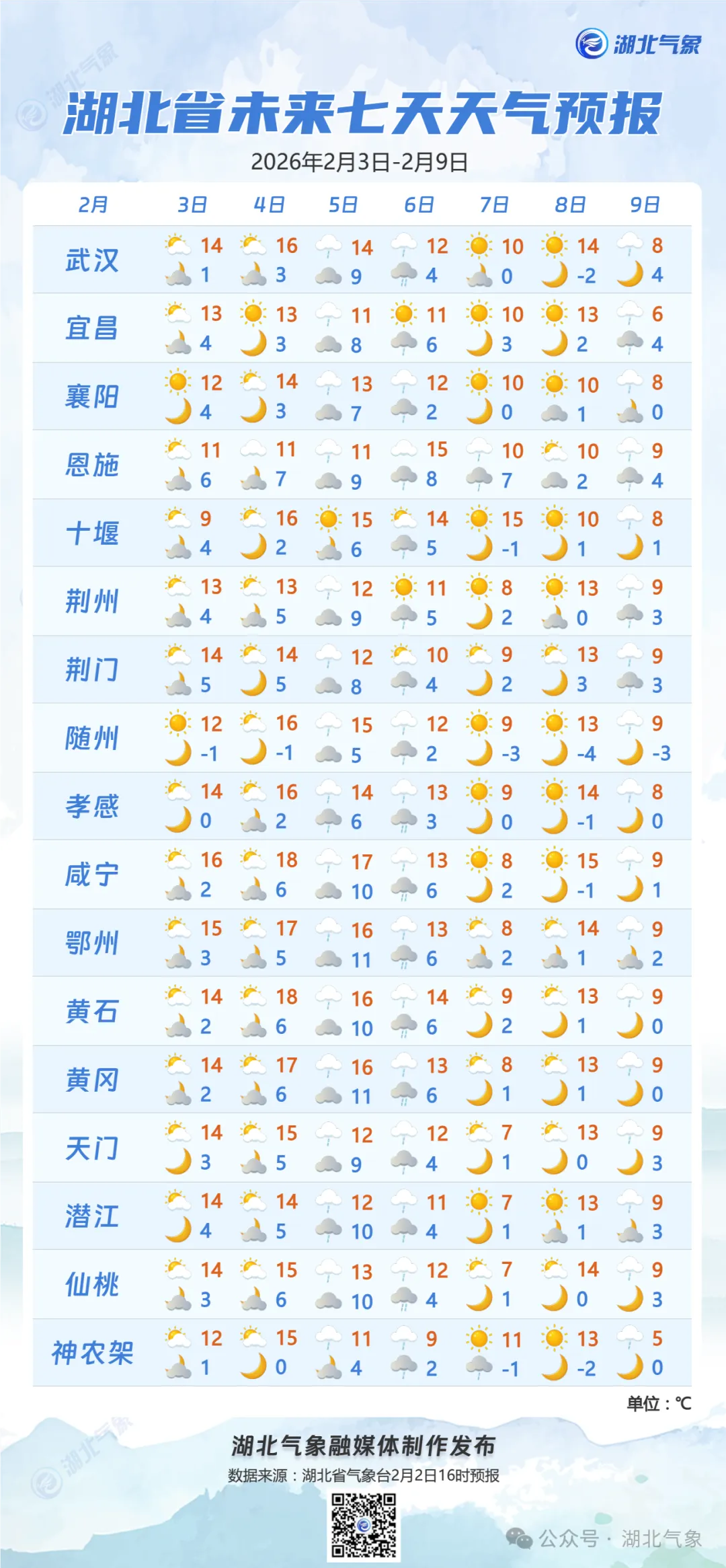2月4日08时-5日08时,全省多云到阴天,其中鄂西南、江汉平原、鄂东北、鄂东南局地有零星小雨。最高气温恩施地区9~13℃、其他地区14~19℃,最低气温北部-1~4℃、南部4~9℃,偏南风转偏北风2到3级。