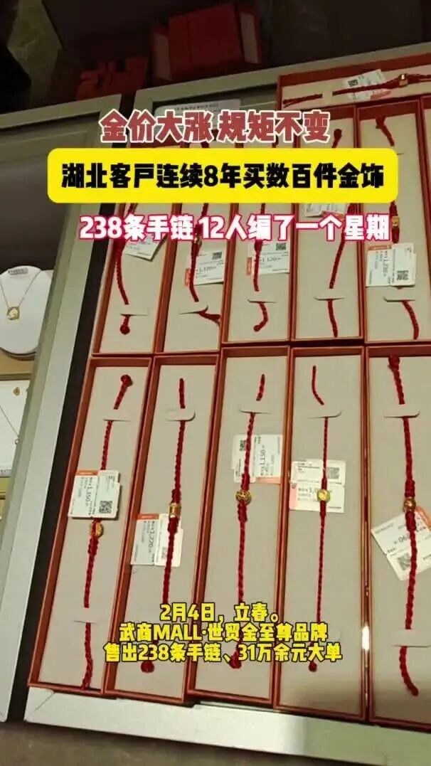 “这个客户是第8年买我们品牌的金饰了,听说是年会上奖励员工的!”2月4日晚6时,武商MALL·世贸金至尊品牌店长刘志荣送走两位前来取货的客户代表,望着满载238件金饰的礼盒,语气里满是感慨。这场耗时近3小时的取货流程,背后是横跨8年的信任与默契——自2019年首次合作以来,这位客户每年春节前都会准时下单。