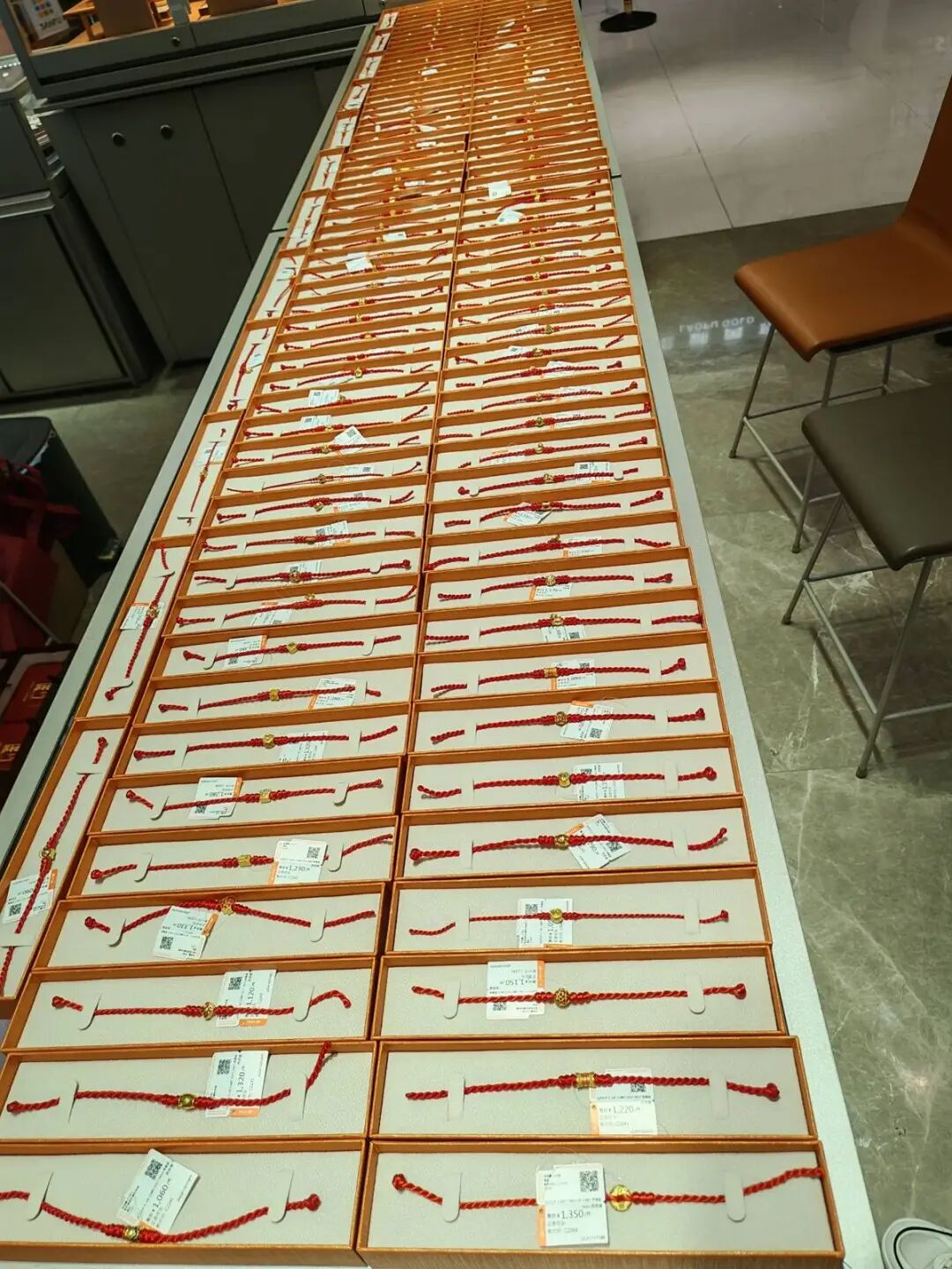 此次交付的金饰总价超过31万元,以幸运手绳、路路通、“马上有钱”吊坠等小巧精致的款式为主。刘志荣介绍,今年的238件金饰与去年采购量略有差异,但总预算基本持平。为满足需求,门店12名员工提前一个月便启动筹备,两个班组轮流编结红绳,耗时一周完成200余条手绳的定制,后续又根据客户筛选意见调整货品,确保每件礼品都贴合期待。