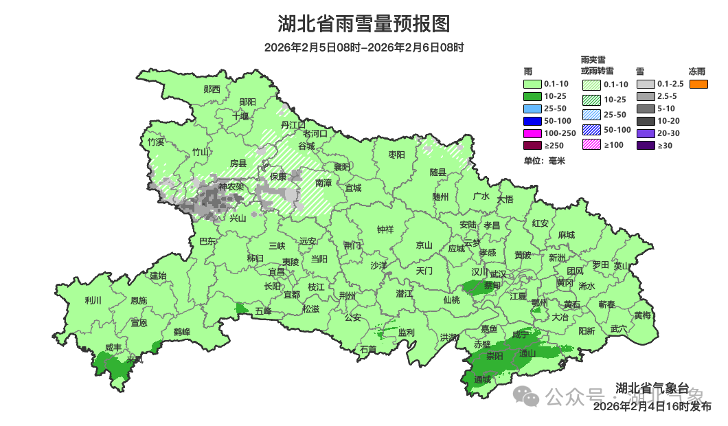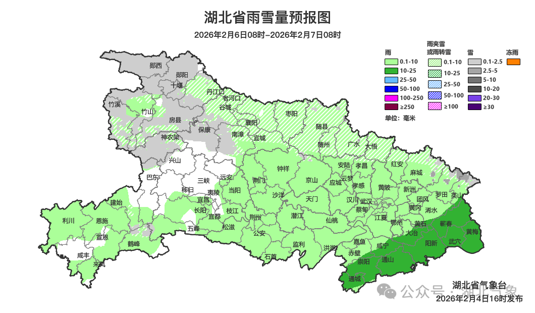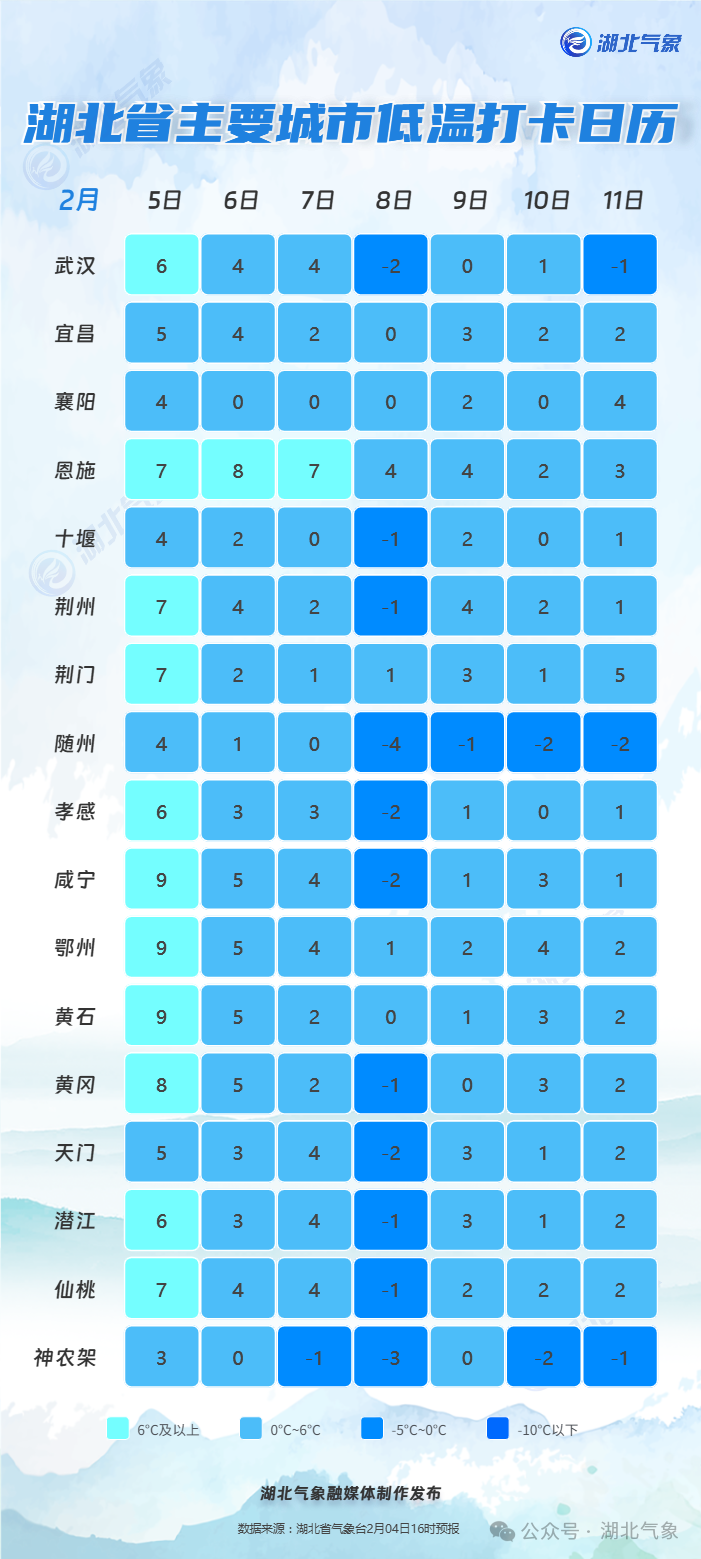 2月6日08时-7日08时,鄂西北、鄂西南北部、鄂东北北部阴天有小雨或雨夹雪,中高山区有小到中雪;其他地区阴天有小雨,鄂东南中雨。最高气温北部3~9℃、南部9~12℃,最低气温-1~5℃,偏北风4到5级、阵风6到8级。