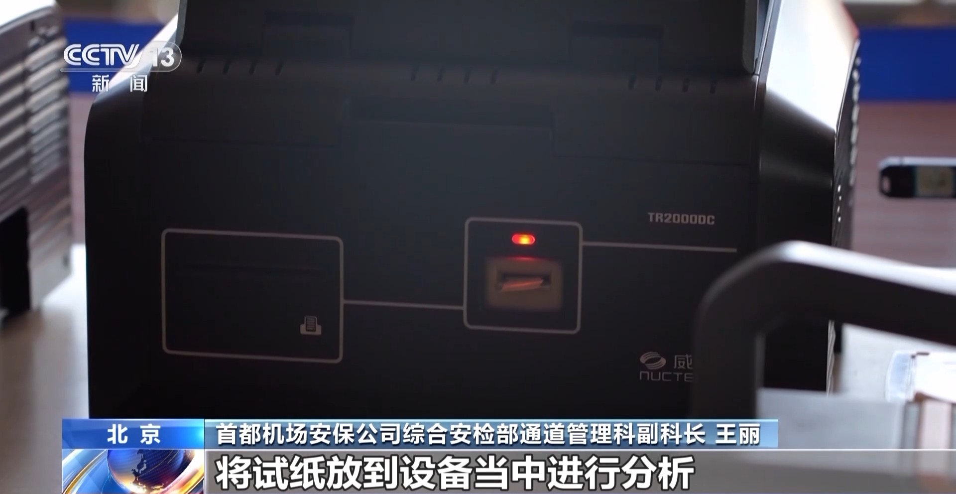 首都机场安保公司综合安检部通道管理科副科长 王丽:取样结束之后,将试纸放到设备当中进行分析,通过数据分析,我们来判断是否存在爆炸物质的残留物质。