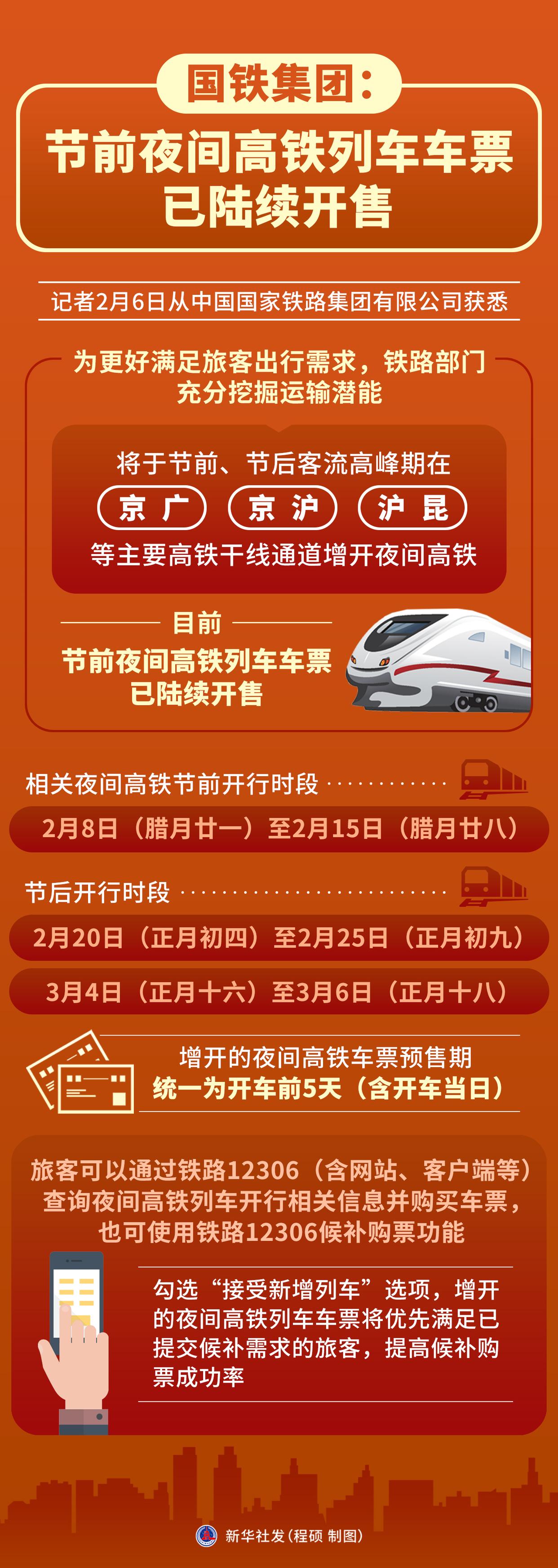 记者2月6日从中国国家铁路集团有限公司获悉,为更好满足旅客出行需求,铁路部门充分挖掘运输潜能,将于节前、节后客流高峰期在京广、京沪、沪昆等主要高铁干线通道增开夜间高铁。目前,节前夜间高铁列车车票已陆续开售。