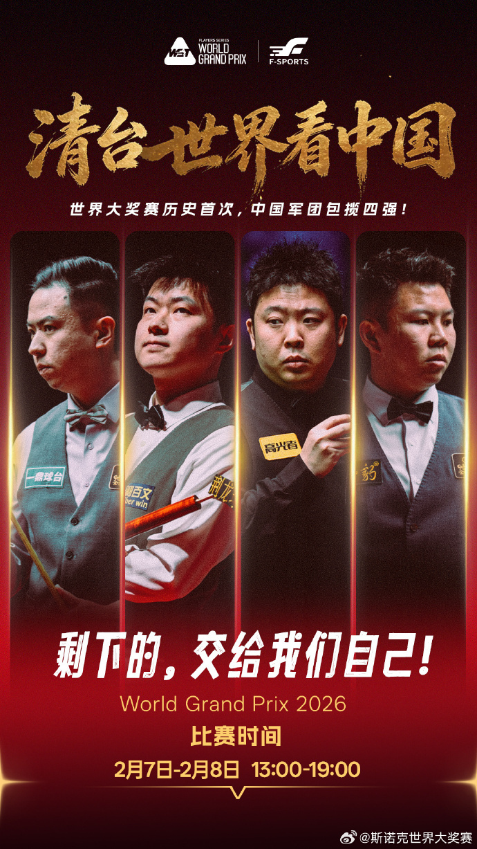 中国球手包揽本届世界大奖赛四强,冠军提前归属中国,开拓了斯诺克历史新局面。