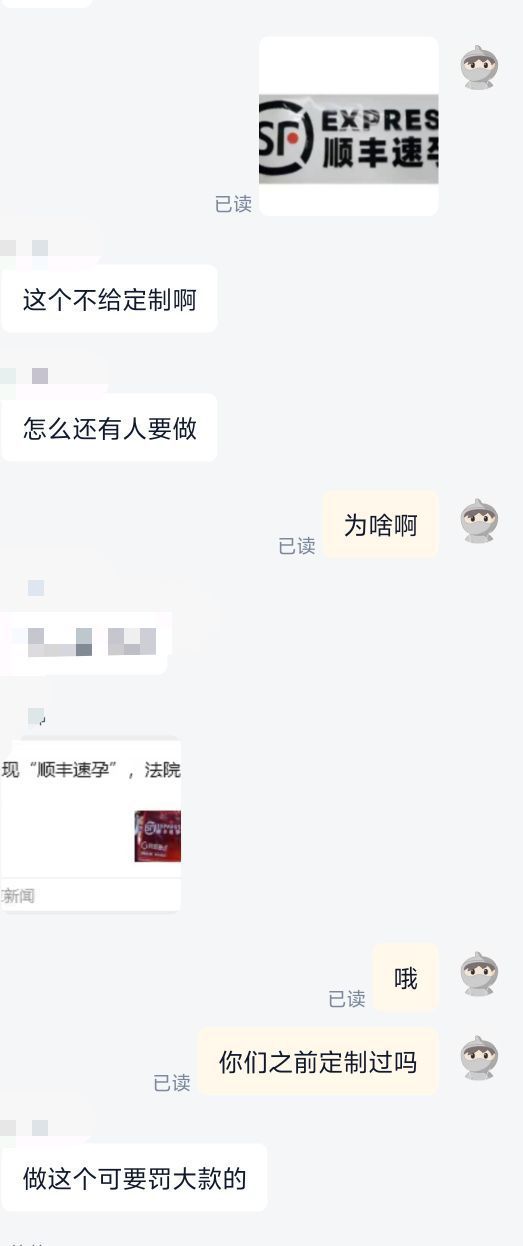 极目新闻记者随机选择了七家做定制车贴的商家,以消费者名义向商家客服发送了被认定侵权的“顺丰速孕”图片,并咨询客服可不可以做同款车贴,仅两名商家客服明确拒绝定制同款车贴,其中一名商家客服说:“怎么还有人要做这种车贴,做这个可是要被罚大款的。”另一名商家客服仅称现在不让做这一同款车贴。而其他五名商家客服则表示可以接单,消费者下单后,客户会根据消费者提供的图片,按相应的规格出效果图,以长为60厘米的规格为例,这五名商家客服给出了26元至35元不等的价格。