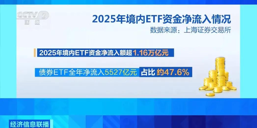 规模快速扩张的同时,资金也在加速流入。2025年,境内ETF资金净流入额超1.16万亿元。其中,债券ETF全年净流入最高,达5527亿元,占比约47.6%。