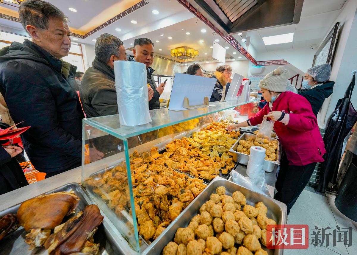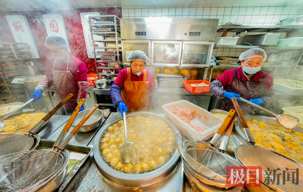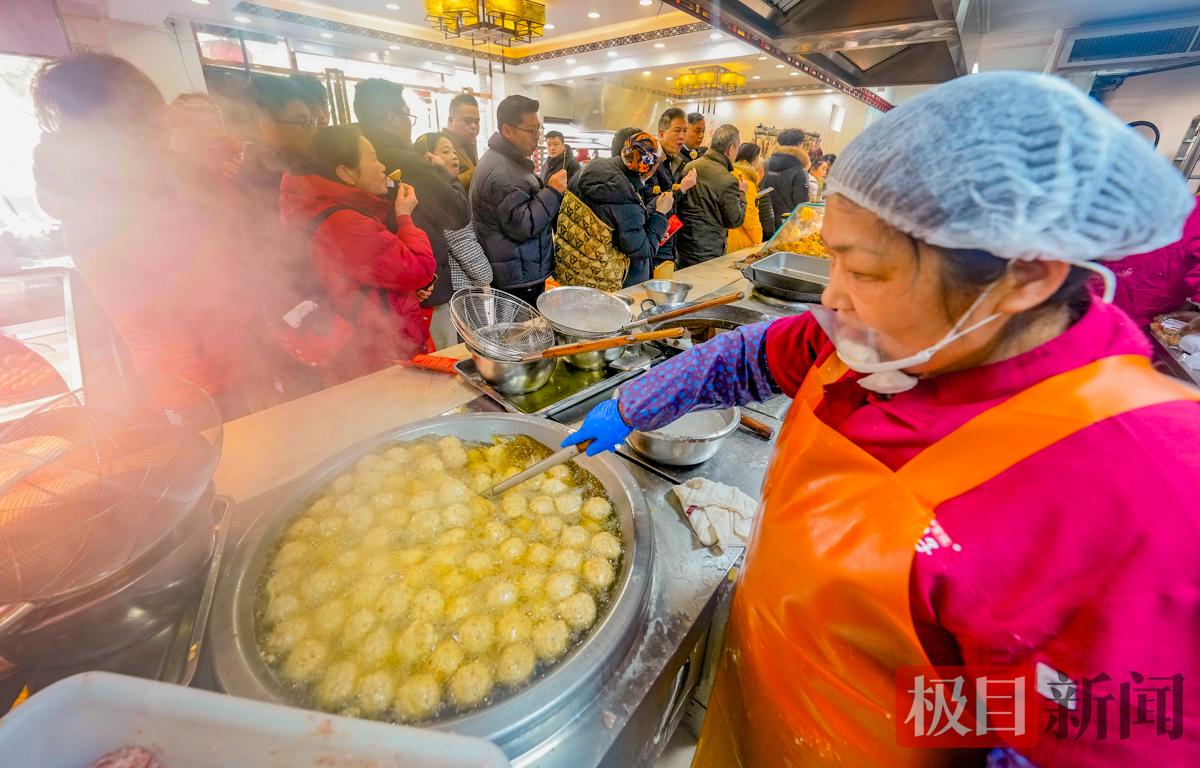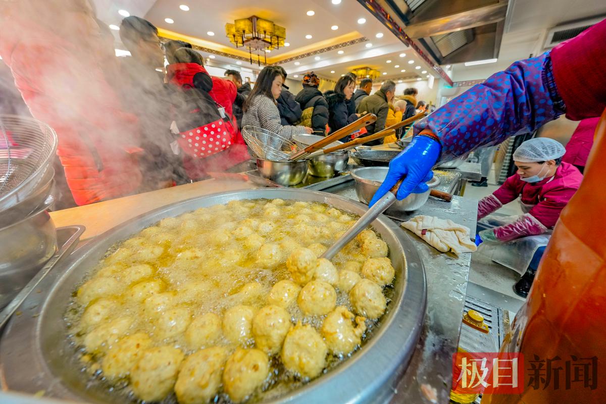 小年将至、春节临近,市民筹办年货的热情高涨。2月8日,武汉市汉阳区太子湖北路升官渡黄焖圆子店,弥漫着诱人的炸肉香味。滋滋作响的油锅旁边,等着热乎乎的圆子出锅的市民排起了长队,3位师傅用手挤出一个个肉团放入油锅炸制,大油锅上飘动着金灿灿的圆子,跟金疙瘩似的,看着就让人心里美滋滋的。