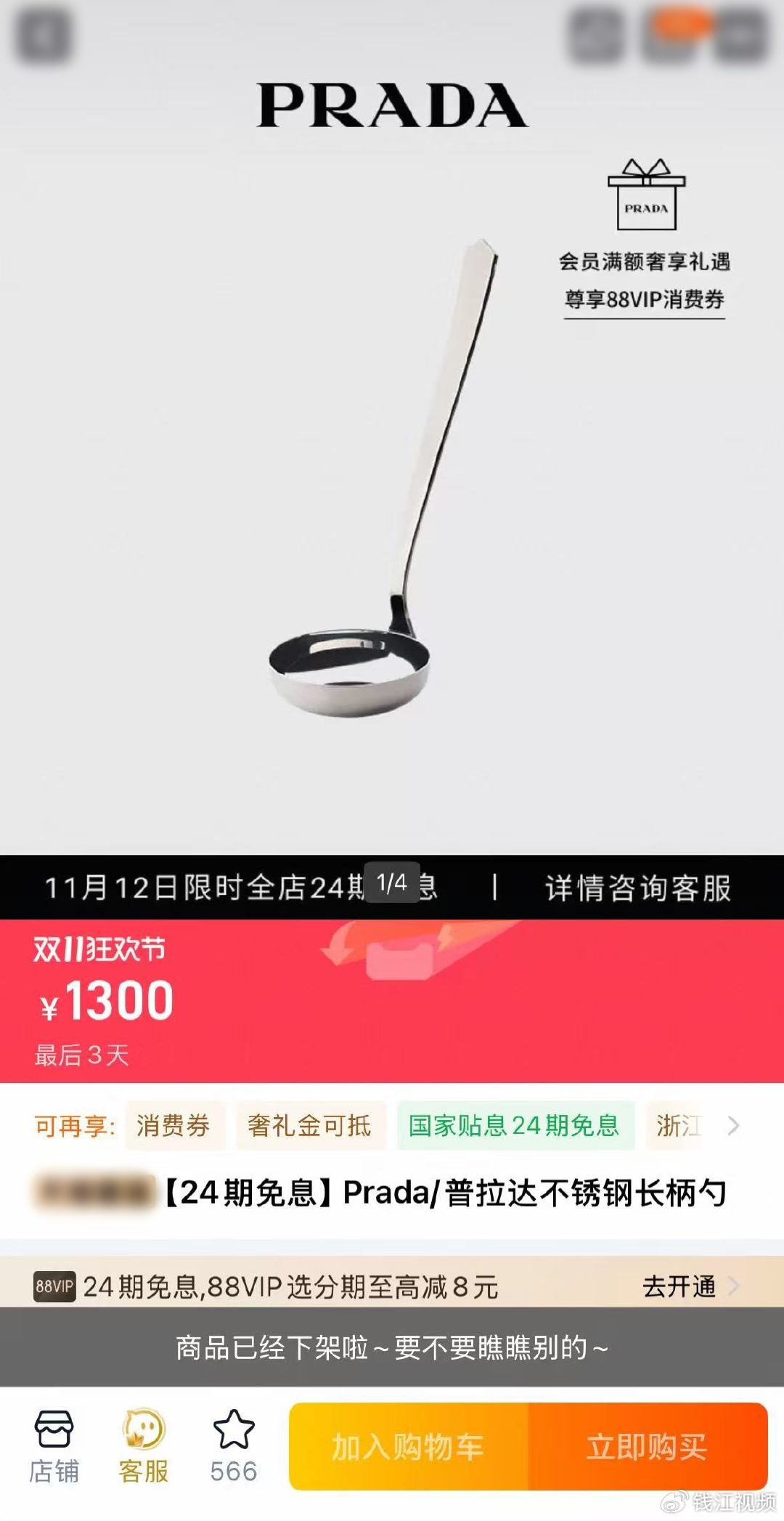 据钱江视频2025年11月报道,有网友在社交网站发帖称,Prada一款不锈钢长柄勺标价1300元。不少网友吐槽价格太高。记者咨询客服人员后,当天下午再次查询电商网站的Prada旗舰店,发现该商品显示已下架。品牌小程序仍有售卖,显示“即将售罄”。