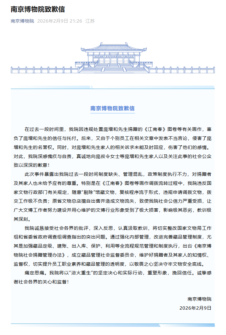 南京博物院致歉信