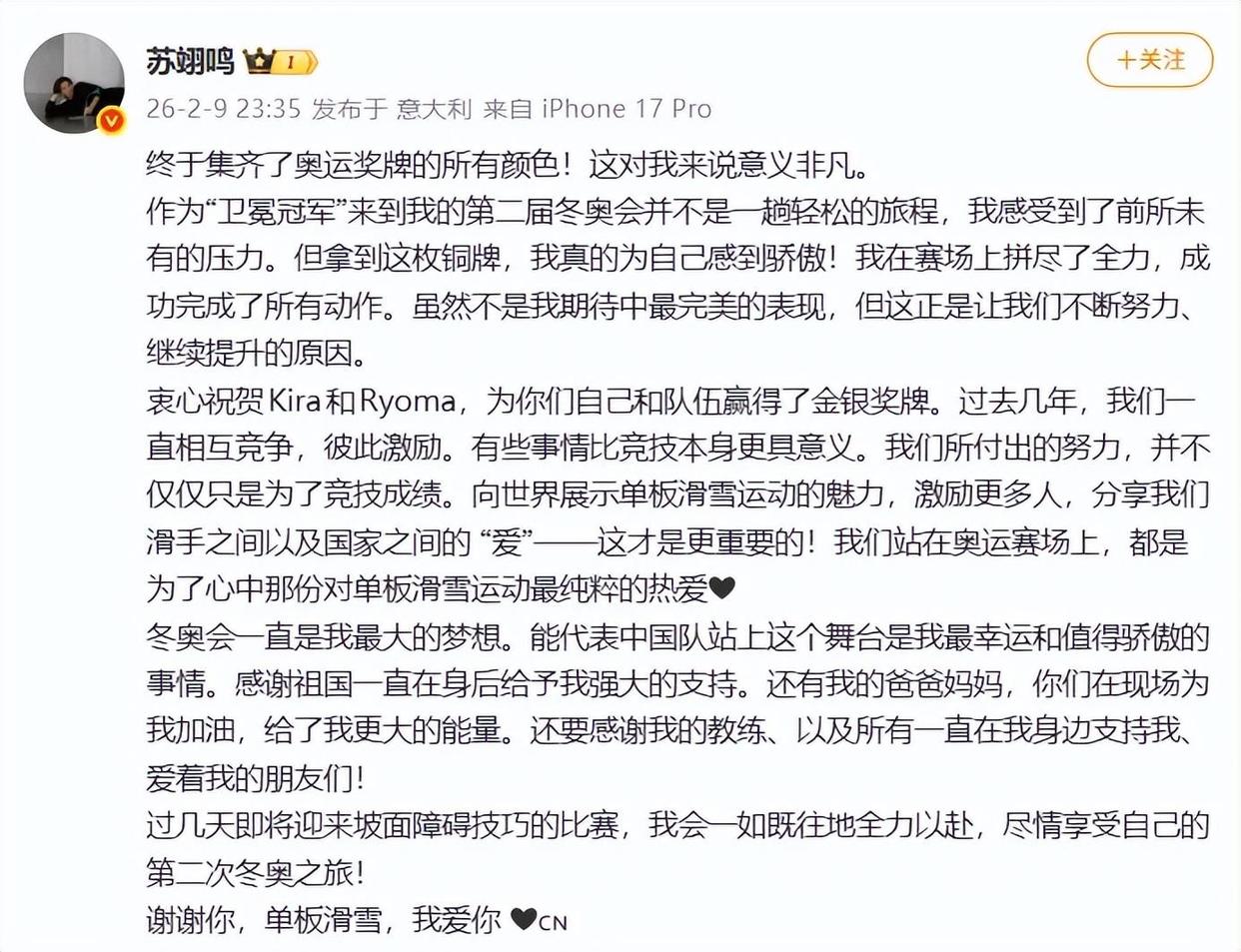 2月9日深夜,苏翊鸣发文回应摘铜,全文如下: