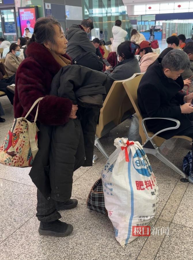 极目新闻记者在人群中注意到一对年近七旬的老人,他们手中各提着一个鼓鼓的编织袋和布包,正四处张望,寻找检票口。记者上前询问得知,他们刚从湖南坐了四五个小时火车抵达南昌,还要转车前往吉安的女儿女婿家过年。