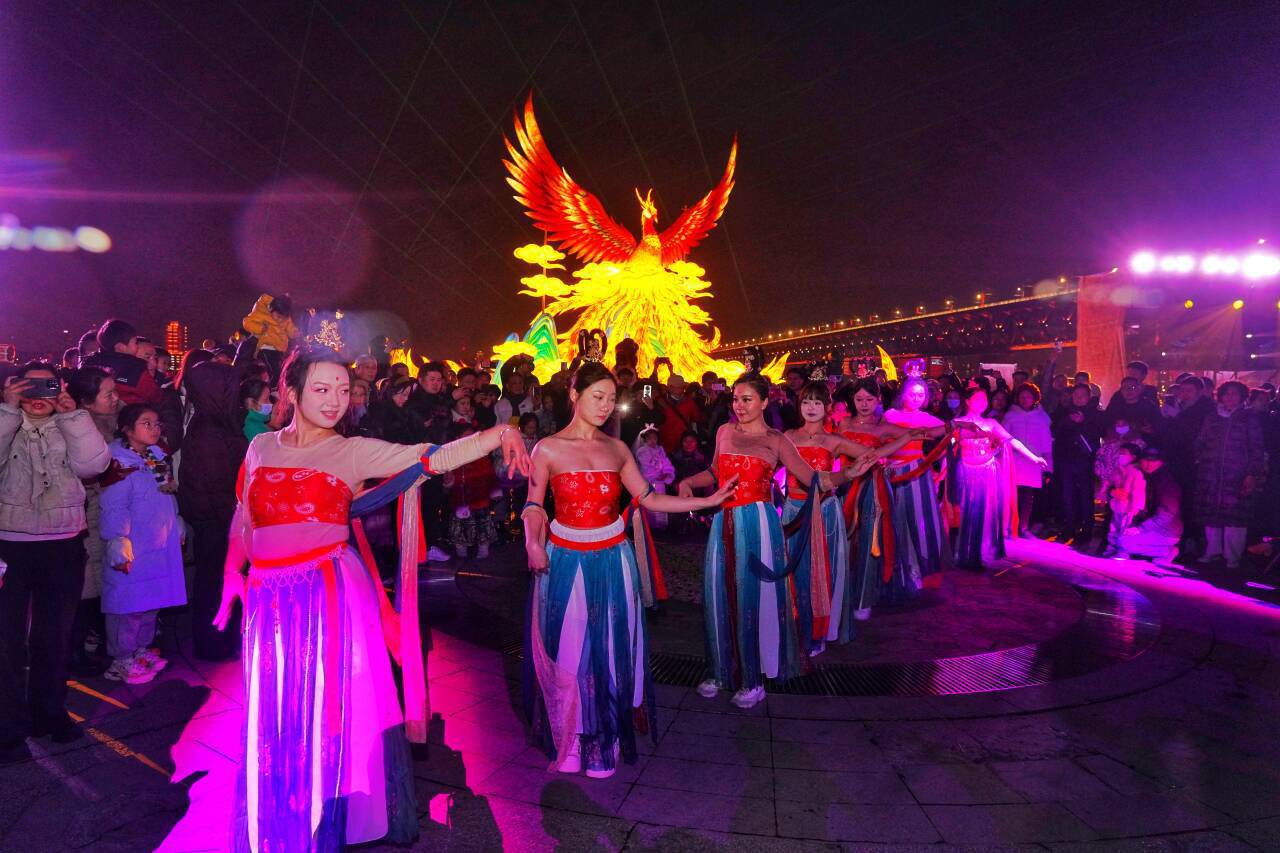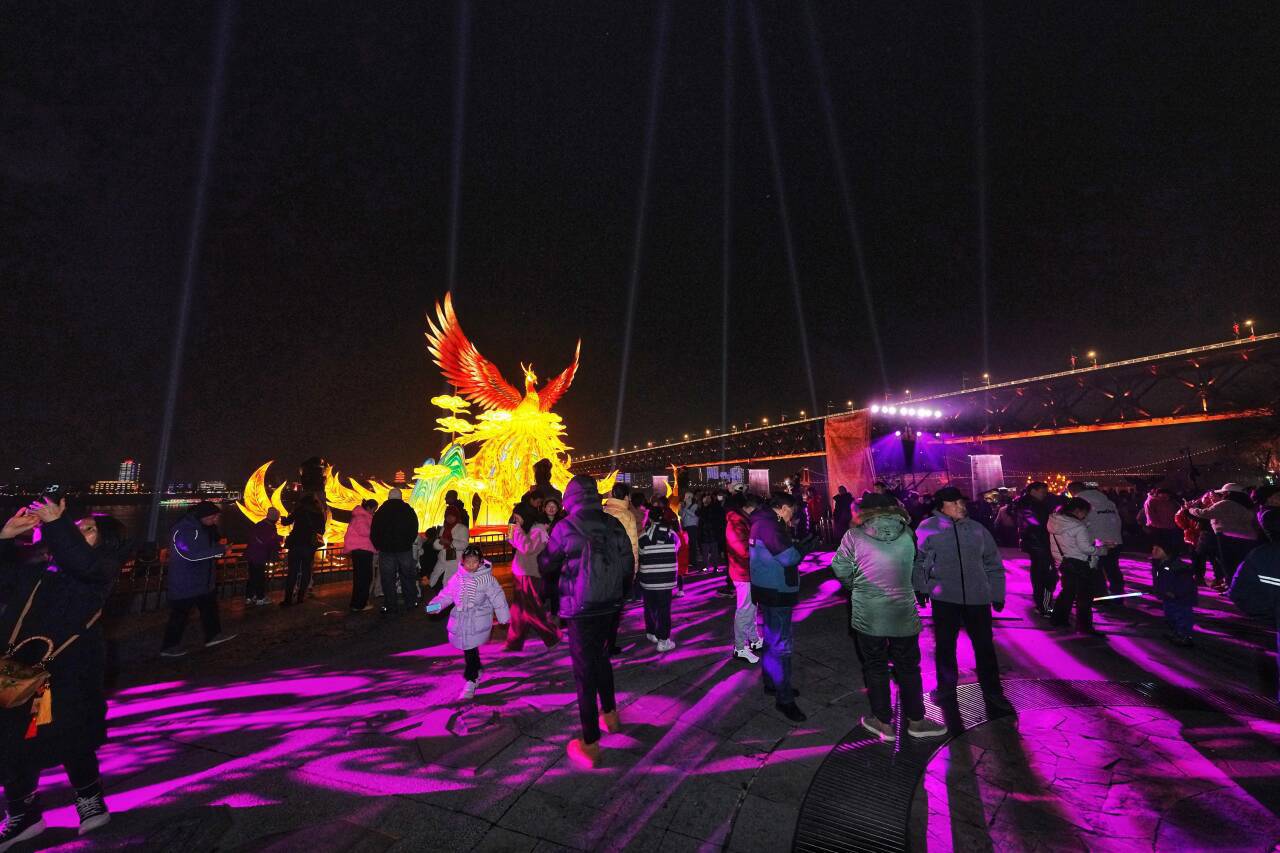 长江大桥下,夜色为纸,灯光作墨,行人步履轻缓,地上流转着《晴川夕照》等与武汉相关的诗句,忽有穿着宽袍广袖的汉服“诗仙”踏光而来,与这满街的平仄撞个满怀。长江边,“凤舞九天”与“一桥飞架南北”相映成趣,颇为壮观。2月10日,2026武汉新春晴川灯会璀璨启幕。