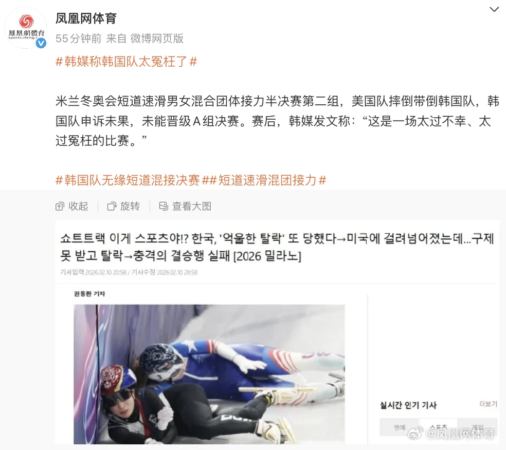 在此前的米兰冬奥会短道速滑男女混合团体接力半决赛第二组,美国队摔倒带倒韩国队,韩国队申诉未果,未能晋级A组决赛。