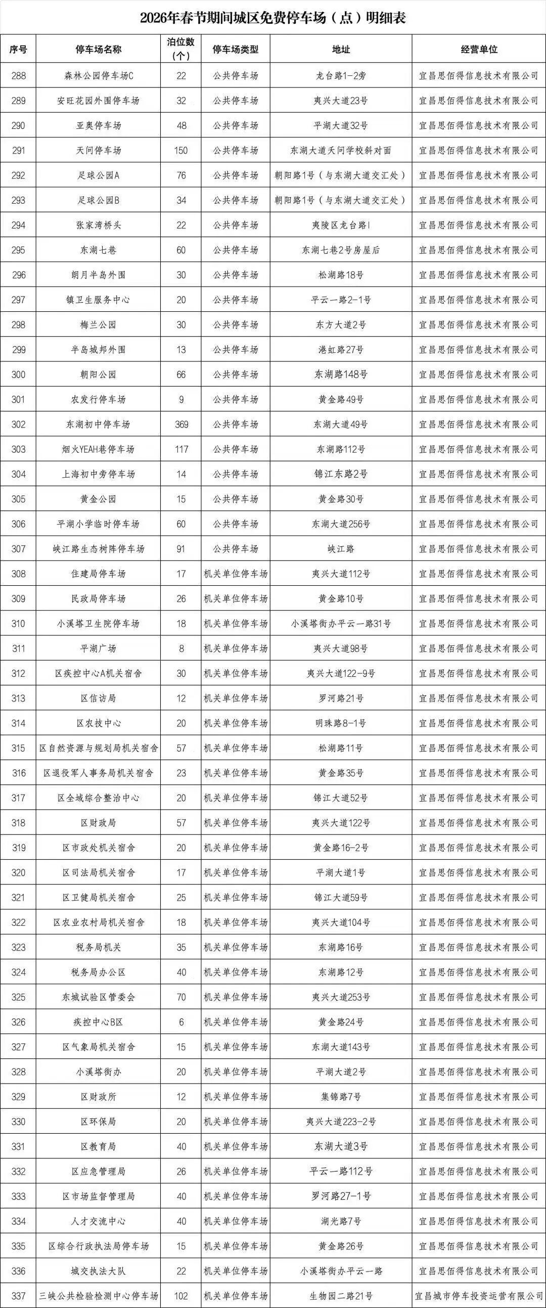 2月15日0:00——2月23日24:00,宜昌市城管委、宜昌市发改委联合相关国有停车设施运营企业,在全市范围内开展免费停车活动。宜昌城发集团自营公共停车场及道路临时停车泊位、部分县市区属国有停车运营企业负责经营管理的公共停车场、具备条件的机关事业单位内部停车场,全市713个停车场(点)、61570个泊位免费停放,其中城区有337个停车场(点)、24883个泊位。