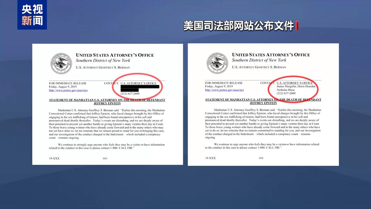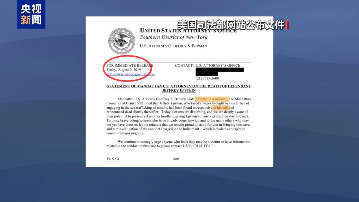 此外,有消息显示,上月底公布的文件中,还有美国纽约南区联邦检察官办公室的死亡声明草稿,内容是爱泼斯坦于“今天早间”“在其牢房中”身亡,日期赫然写着“2019年8月9日”,也就是爱泼斯坦死亡的前一天。与后来公布的正式声明不同,这个“早产”的声明草稿没有提及“疑似自杀”的字样,仅模糊表述为爱泼斯坦“不省人事,随后被宣告死亡”。