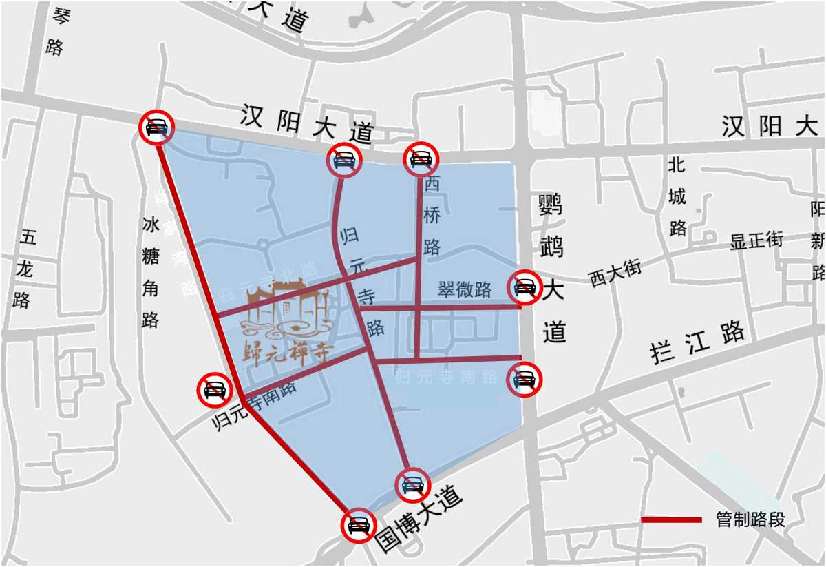 2月16日(除夕)22:00至17日(初一)18:00、2月20日(初四)22:00至21日(初五)18:00,汉阳区归元寺路、西桥路、翠微路、归元寺北路、归元寺南路、肖家湾路禁止机动车及非机动车通行和停放。