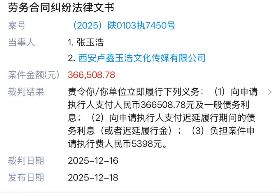 2025年9月10日,张玉浩因劳务合同纠纷,向碑林区法院申请对西安卢鑫玉浩文化传媒有限公司执行,案号(2025)陕0103执7450号。申请执行内容为,36.65万元及一般债务利息;支付迟延履行期间的债务利息;负担案件申请执行费5398元。