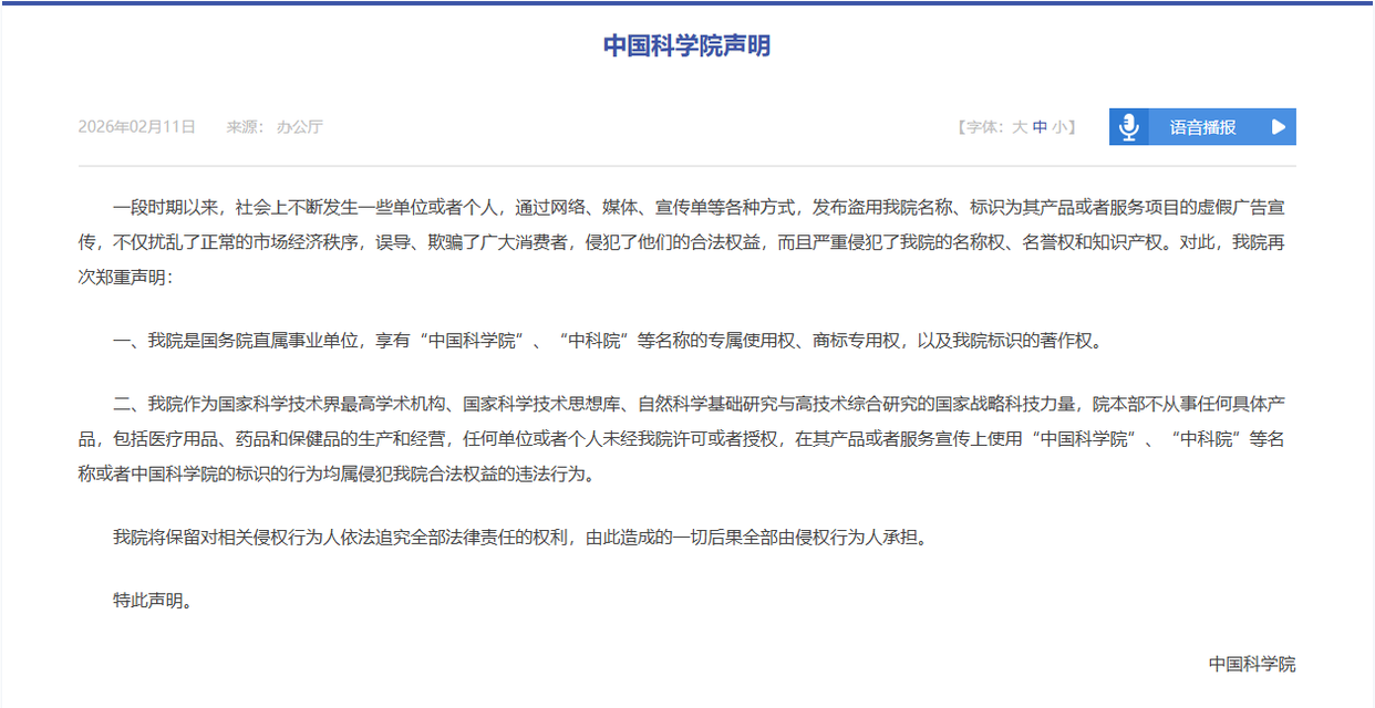 二、我院作为国家科学技术界最高学术机构、国家科学技术思想库、自然科学基础研究与高技术综合研究的国家战略科技力量,院本部不从事任何具体产品,包括医疗用品、药品和保健品的生产和经营,任何单位或者个人未经我院许可或者授权,在其产品或者服务宣传上使用“中国科学院”、“中科院”等名称或者中国科学院的标识的行为均属侵犯我院合法权益的违法行为。