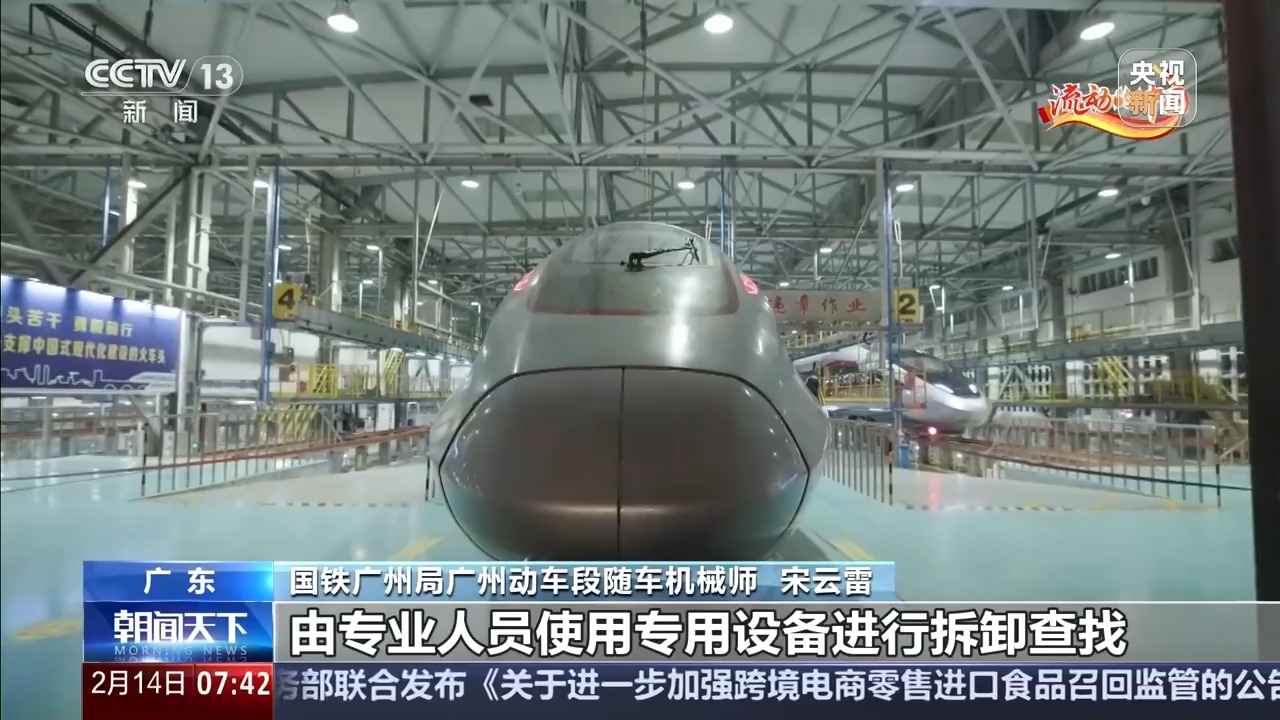 国铁广州局广州动车段随车机械师 宋云雷:如果现场无法取出,我们会在列车结束运营回到检修库后,由专业人员使用专用设备进行拆卸查找。