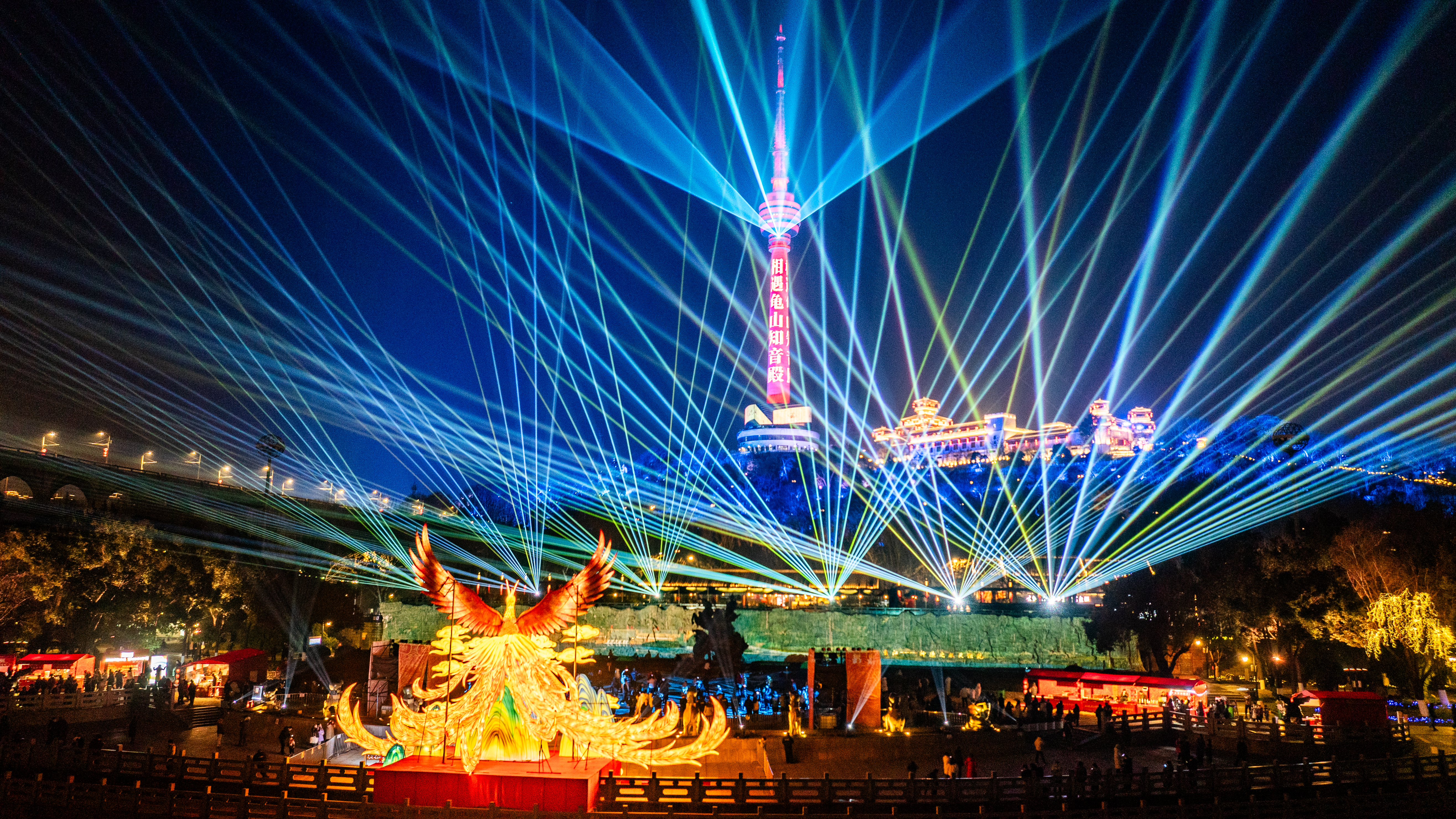 汉阳江滩,武汉首届晴川灯会开放,13.5米高的火凤凰花灯,与矗立于江边的晴川阁交相辉映。
