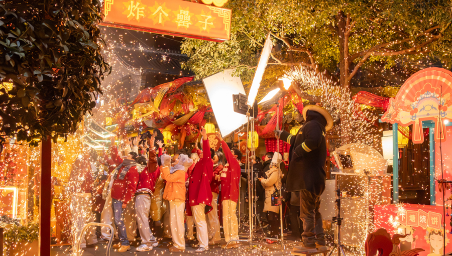 鱼灯是安徽传统新春民俗,承载着“年年有余”的美好寓意。节目组将巡游场景设在三河古镇,让最地道的合肥烟火气跃然荧屏。活灵活现的“鱼”群在古镇游动,既有传统民俗的喜庆,又有梦幻般的美感。