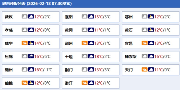 今天,全省多云,其中恩施地区局地有小雨。上午中东部局地有雾。最高气温北部15至18℃、南部11至15℃,最低气温北部-1至2℃、南部2至5℃,偏北风2到3级。