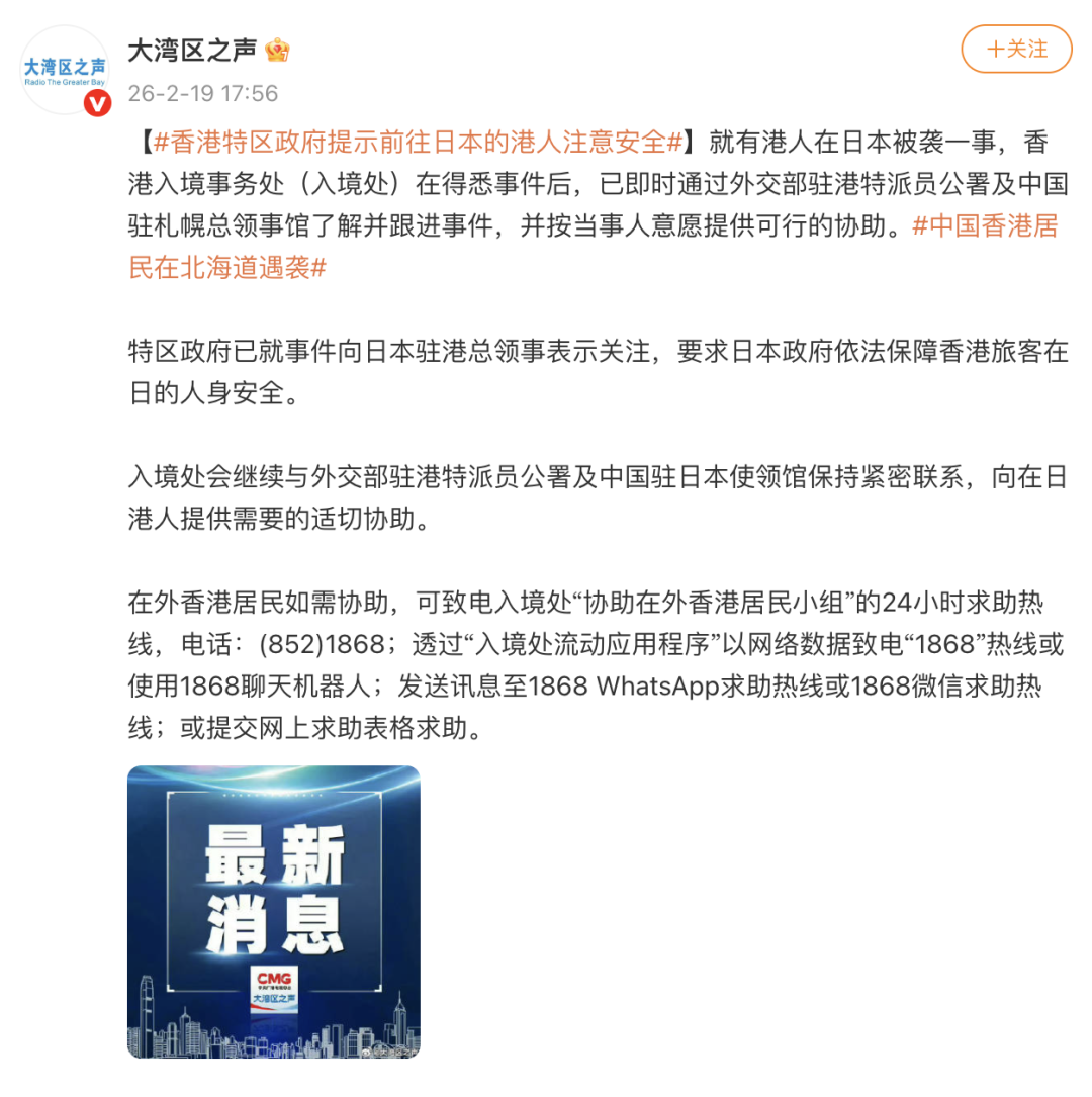 据@大湾区之声 2月19日消息,香港特区政府提示前往日本的港人注意安全。