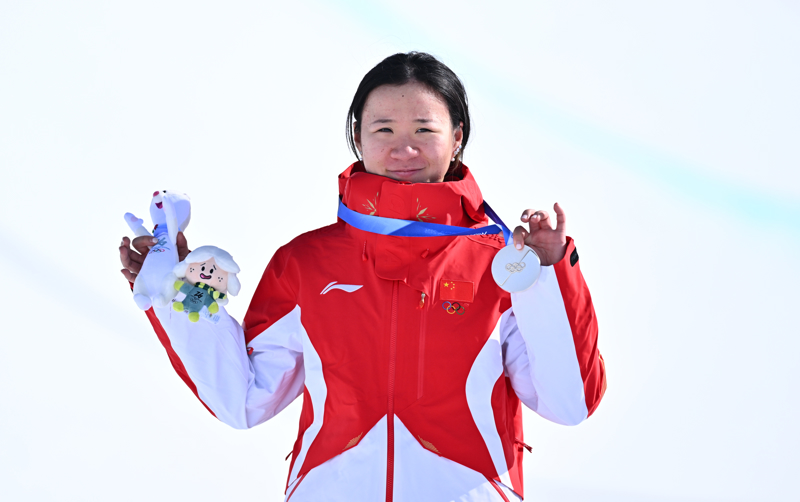 2月22日,亚军中国选手李方慧在颁奖仪式上。 当地时间2月22日,在意大利利维尼奥举行的米兰-科尔蒂纳冬奥会自由式滑雪女子U型场地技巧决赛中,中国选手谷爱凌、李方慧分获冠、亚军。 新华社记者 张宏祥 摄
