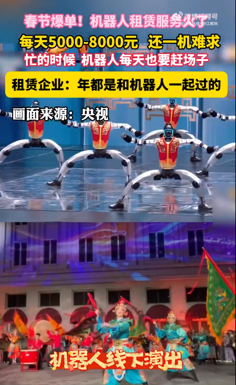 机器人租赁市场迎来消费旺季。杭州星枢智能科技公司负责人金鸿猷介绍,与去年同期相比,机器人租金下降超一半,订单已排至3 月中旬。受《武 BOT》影响,客户对机器人的定制化需求激增,纷纷要求机器人具备翻滚等复杂动作。从杭州到二三线城市,机器人租赁热度持续攀升。春节期间,小型机器人日租金在5000至8000元,大型机器人则达1万至1.5 万元,成为各类场景的 “香饽饽”。